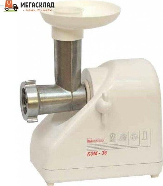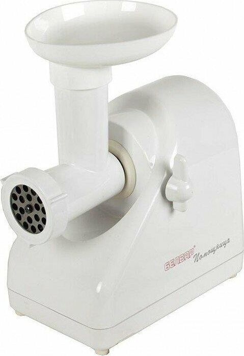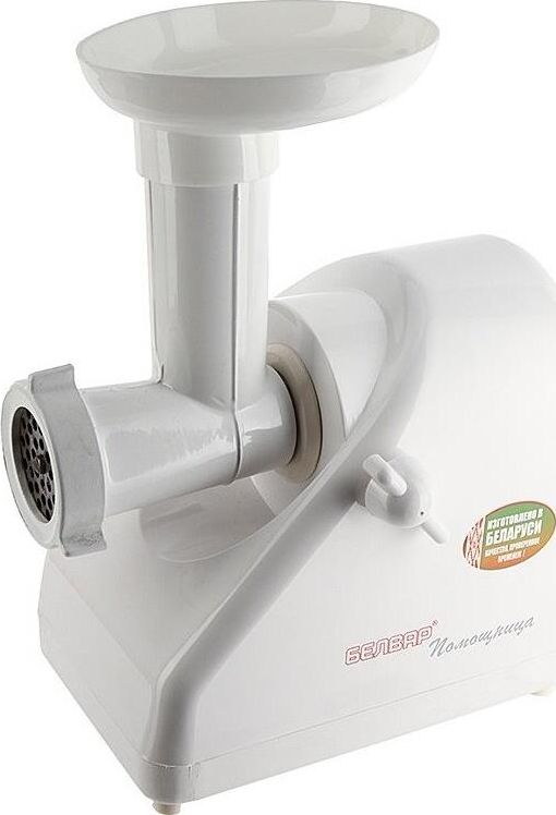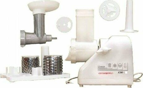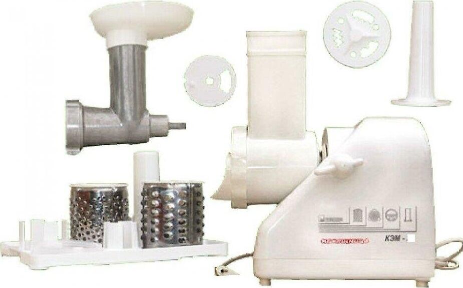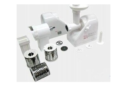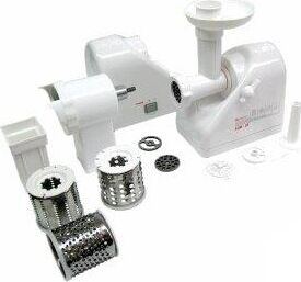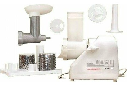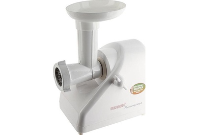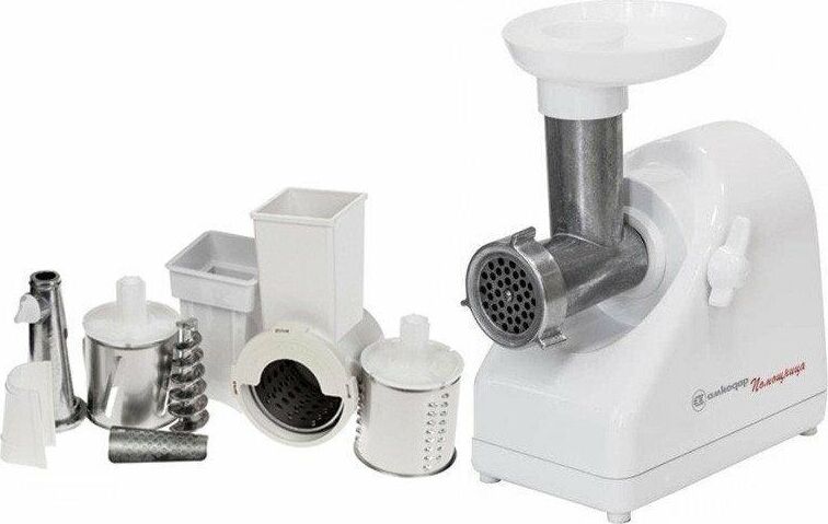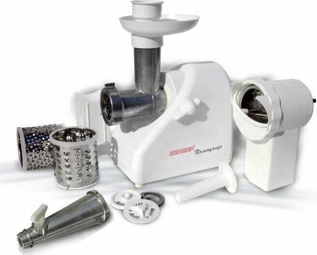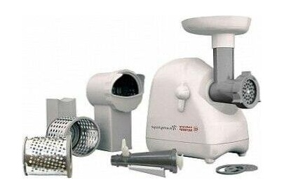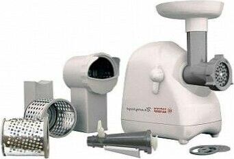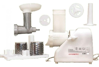 Мощность 400 Вт, шинковка, реверс, насадка для теста, насадка для колбас, белое эмалированное покрытие приставки-мясорубки, 4 сменных барабана