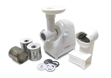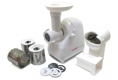 Мясорубка Белвар Помощница КЭМ-П2У 302-06, макс. мощность 1500Вт, номинальная от 220Вт, шинковка, реверс, насадка д/теста, насадка д/колбас, белое эмал. покрытие, приставка-мясорубка, 4 смен. барабана, 3 смен. решетки, основание д/хранения насадок.