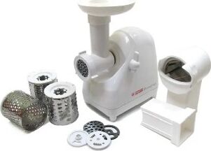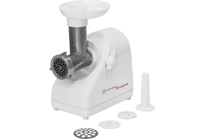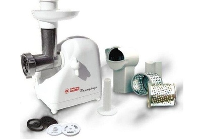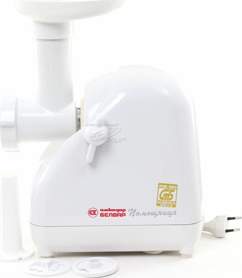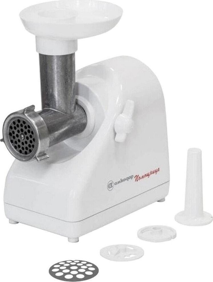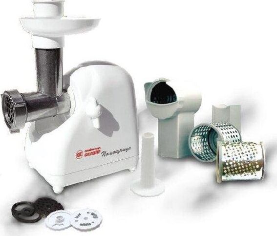 Мясорубка Белвар Помощница КЭМ-П2У 302-06, макс. мощность 1500Вт, номинальная от 220Вт, шинковка, реверс, насадка д/теста, насадка д/колбас, белое эмал. покрытие, приставка-мясорубка, 4 смен. барабана, 3 смен. решетки, основание д/хранения насадок.