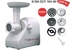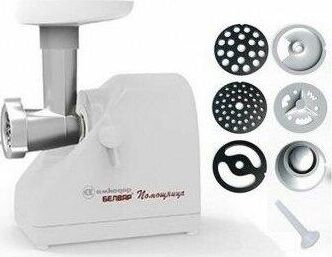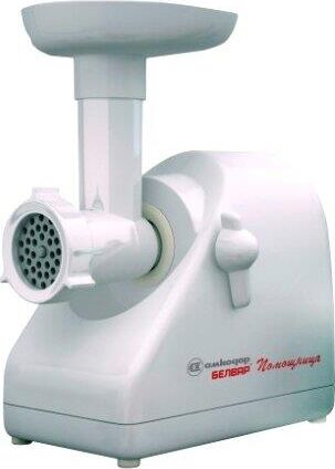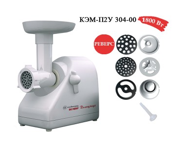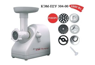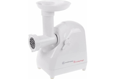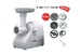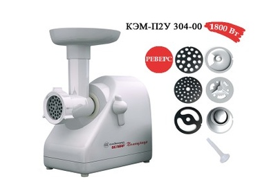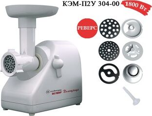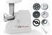 Электромясорубка. Пиковая мощность: 300Вт Номинальная мощность: 1800Вт Реверс: есть Цвет: белый. Количество сменных решеток 2 (крупная, мелкая) . Насадка для набивки колбас. Насадки для профилирования теста. Решетка для "бефстроганов".