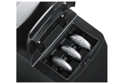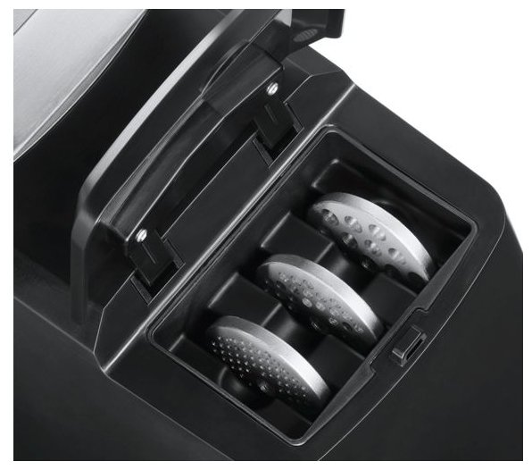 Мощность 800Вт. Пресс д/отжима сока. Быстрая сборка, высокая надежность. Резиновые ножки. Большой загрузочный лоток с толкателем. Насадка д/шинковки и резки, 4 барабана. Насадка д/ кеббе. Насадка д/колбас. Мощность при блок. мотора: 2200 Вт.