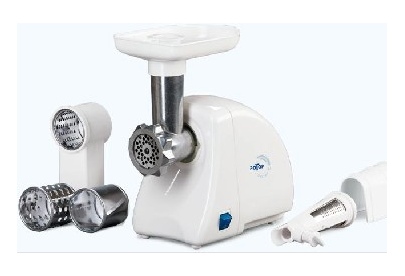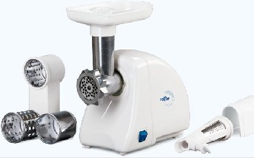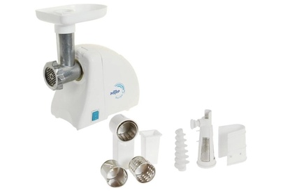Мощность 1500Вт, РЕВЕРС, металлический привод-шнек, кухонный комбайн (три насадки для шинкования овощей, насадка-соковыжималка).