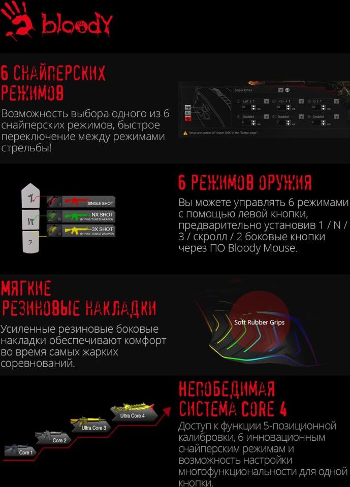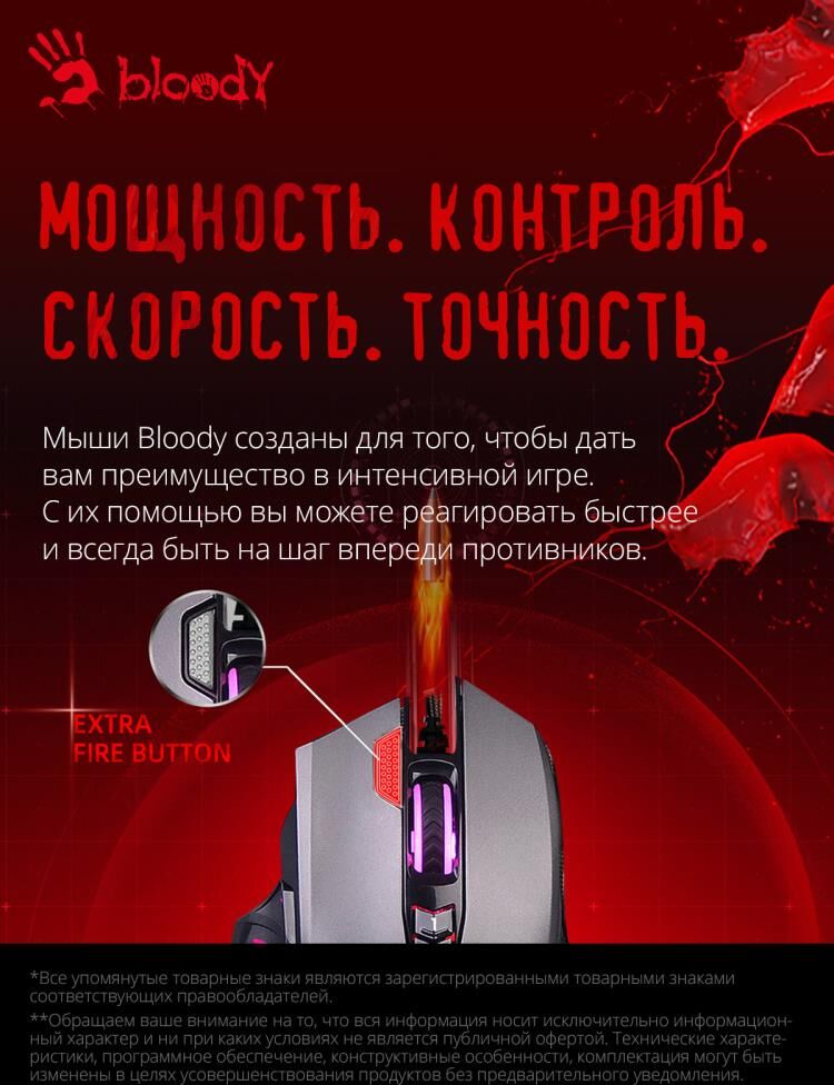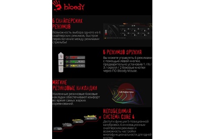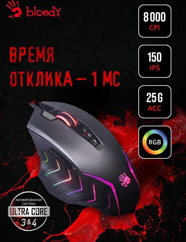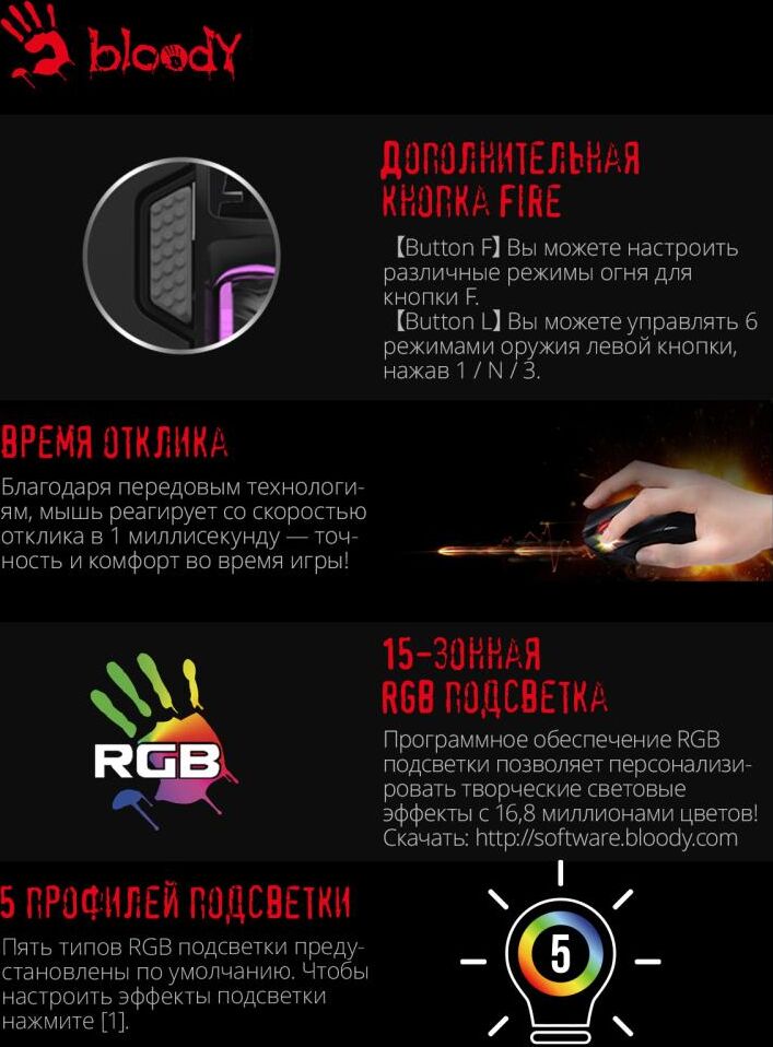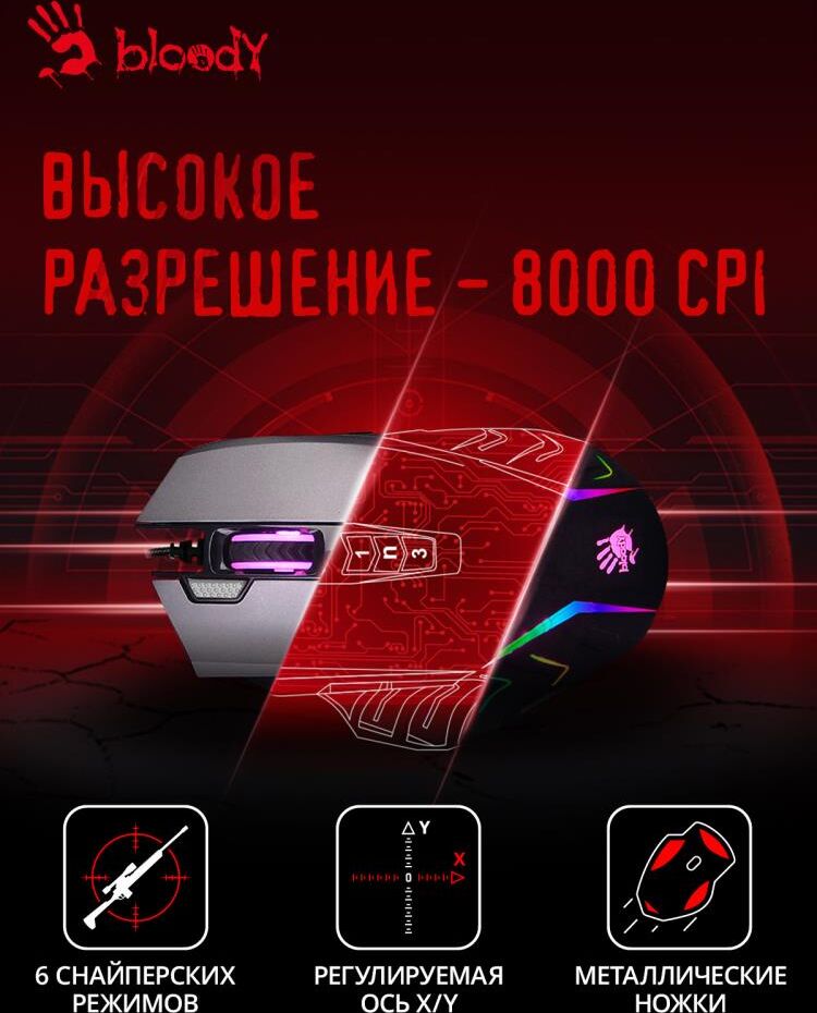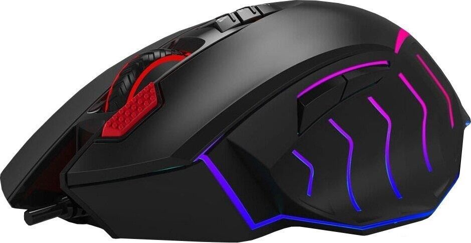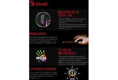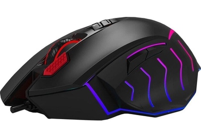 Мышь игровая, проводная, интерфейс USB 3.0, тип подсветки - RGB, количество кнопок - 9, колесо прокрутки, изменяемое разрешение - 1000/2000/3000/4000/5000 dpi, металлические ножки, специальное покрытие корпуса - soft rubber grips на боковых поверхностях, частота опроса: 125 – 1000 Гц/сек., длина кабеля - 1,8 м,
