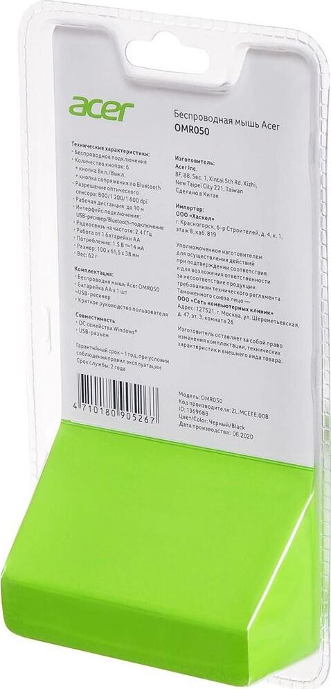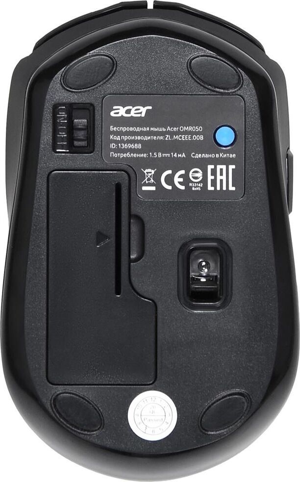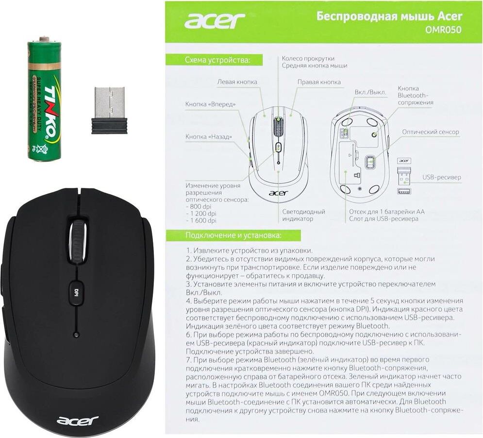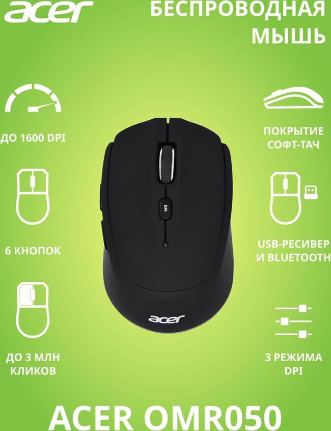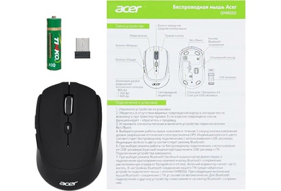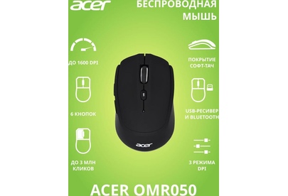 Мышь беспроводная ACER Мышь OMR050 черный оптическая 1600dpi беспров. BT/Radio USB 6but (ZL.MCEEE.00B)