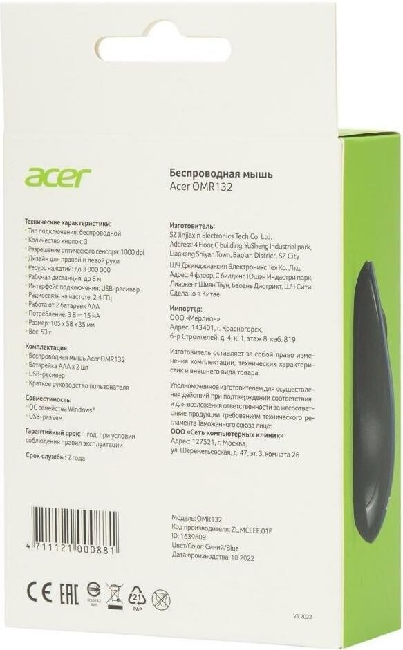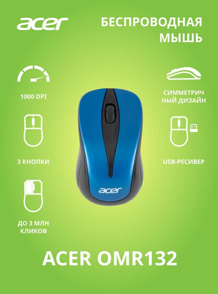 Мышь беспроводная ACER Мышь OMR132 синий/черный оптическая (1000dpi) беспроводная USB для ноутбука (2but)