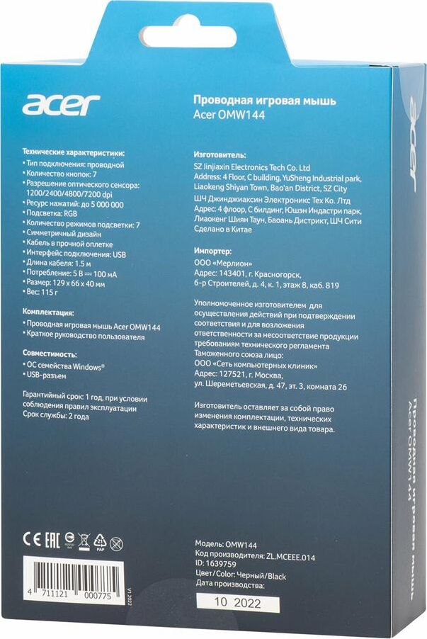Мышь беспроводная ACER Мышь OMW144 черный оптическая 7200dpi USB 7but (ZL.MCEEE.014)