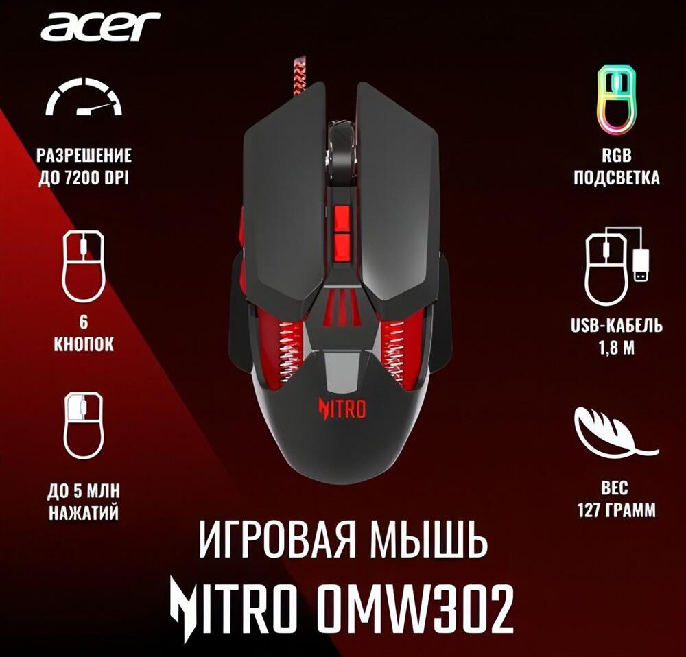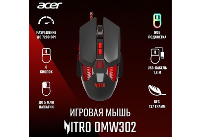 Мышь беспроводная ACER Мышь проводная Nitro OMW302, игровая, оптическая, USB, 7200dpi, черный [zl.mcecc.025]