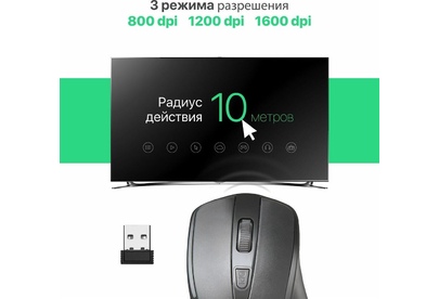 Мышь беспроводная, интерфейс подключения USB, тип сенсора -оптический, рабочая частота 2.4 ГГц, количество кнопок: 3 + колесо-кнопка, разрешение сменное - 800/1200/1600 dpi, питание - 2 хAAA (в комплекте).