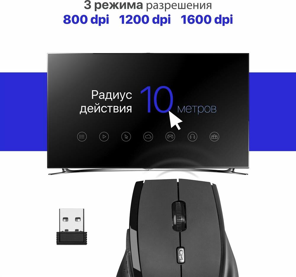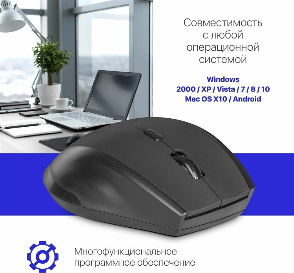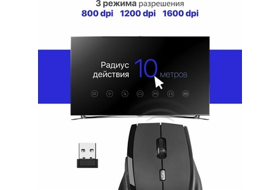 Мышь беспроводная оптическая, интерфейс USB, 5 клавиш+ колесо-кнопка, сменное разрешение сенсора 800/1200/1600 dpi, питание - 2 хAAA (в комплекте) цвет: черный.