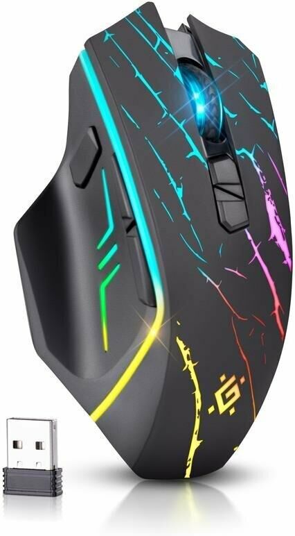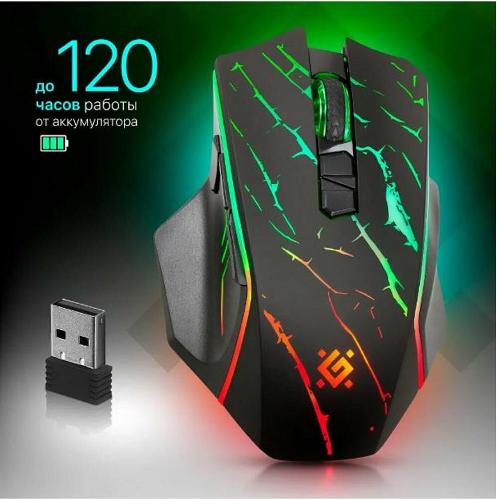 Мышь игровая, беспроводная, интерфейс USB, количество кнопок - 7, колесо прокрутки, емкость аккумулятора - 400 мА·ч, изменяемое разрешение 1200 / 2400 / 3200 dpi, Windows 2000/XP/Vista/7/8/10, Mac OS X10, радиус действия -до 10 м.