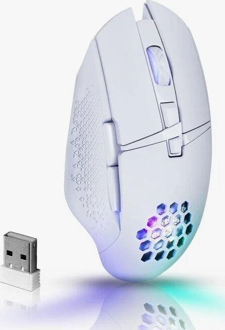 Мышь игровая, беспроводная, интерфейс USB, количество кнопок - 6, колесо прокрутки, емкость аккумулятора - 400 мА·ч, изменяемое разрешение 1200 / 2400 / 3200 dpi, Windows 2000/XP/Vista/7/8/10, Mac OS X10, переливающаяся подсветка, радиус действия -до 10 м.