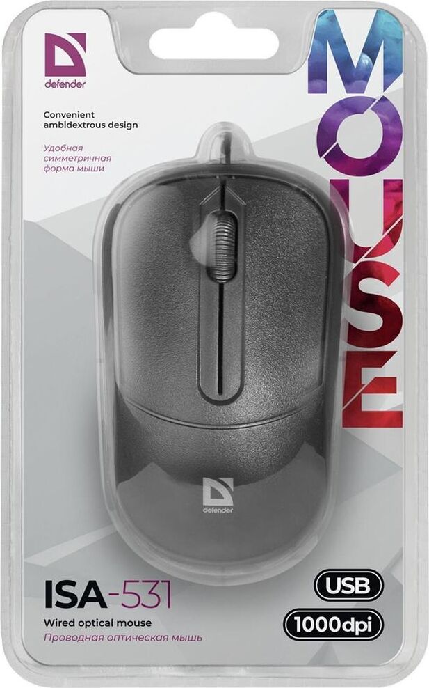 Мышь проводная, оптическая разрешение 1000 dpi, интерфейс подключения USB, количество кнопок 3 + колесо-кнопка, длина кабеля : 1.4 м.