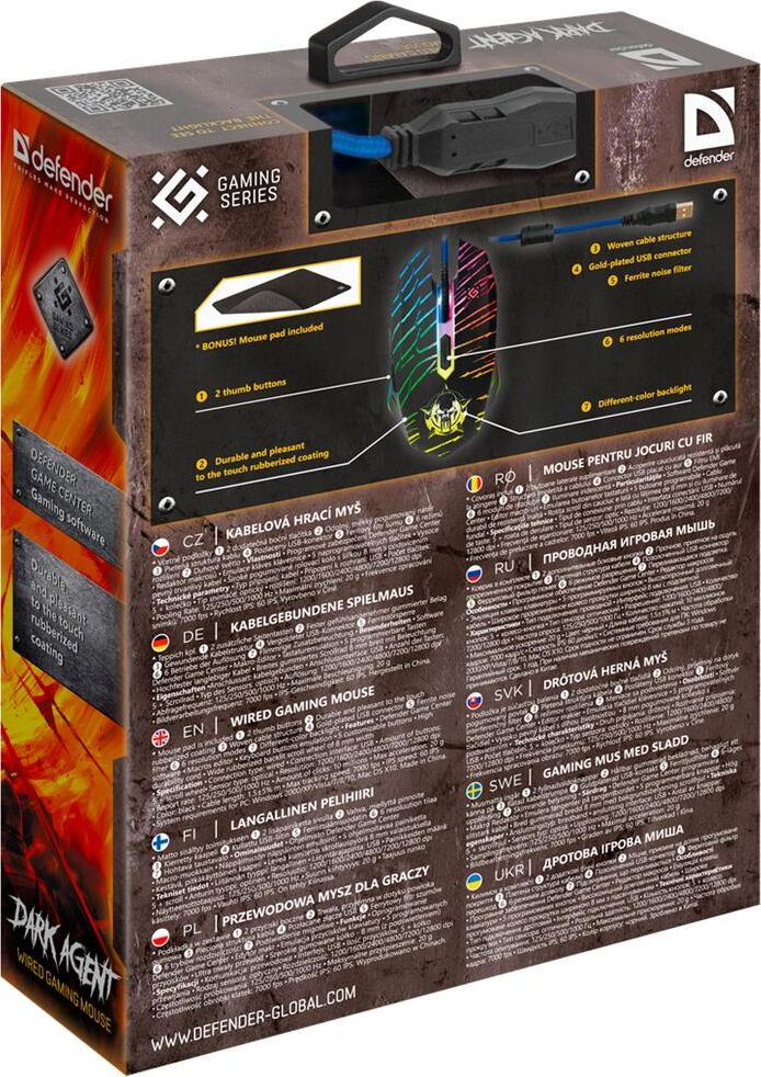 Тип подключения Проводной, Мин. значение DPI: 1200dpi, Макс. значение DPI: 12800 dpi, Интерфейс подключения: USB, Кол-во кнопок: 5 + колесо-кнопка, Частота обработки кадров: 7000, Разрешение: 1200/1600/2400/4800/7200/12800 dpi Частота опроса 125/250/500/1000 Гц, Макс. ускорение: 20 g, Скорость IPS: 60 дюйм/с, ROHS / CE, Длина кабеля: 1.5±5% м.