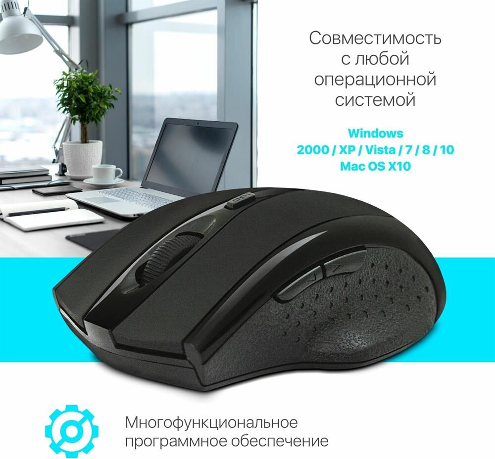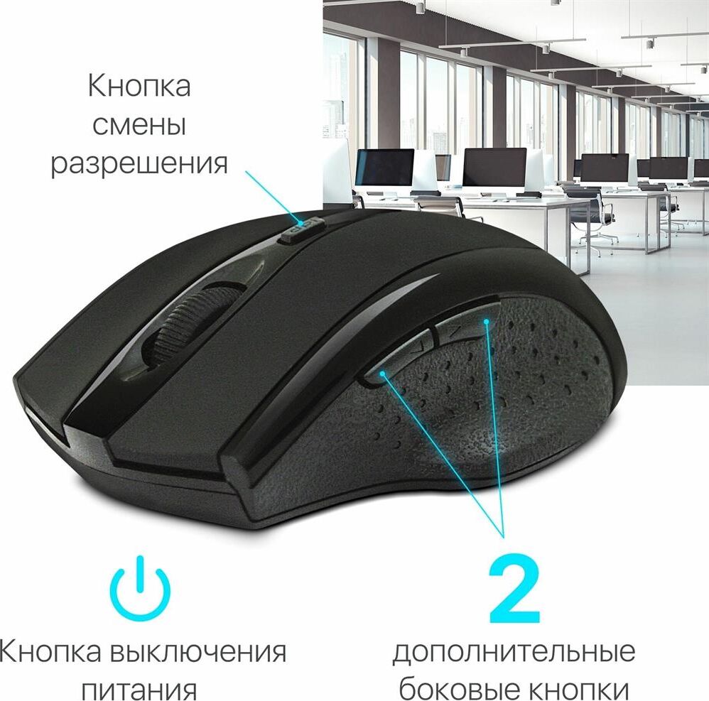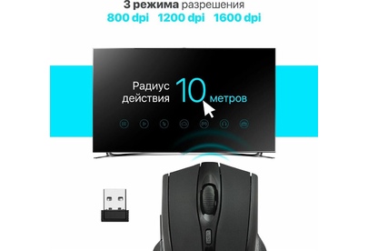 USB, разрешение 800/1200/1600 dpi, 5 + колесо-кнопка, кнопка смены разрешения позволяет менять скорость курсора мыши одним нажатием, радиус действия - до 10 метров
