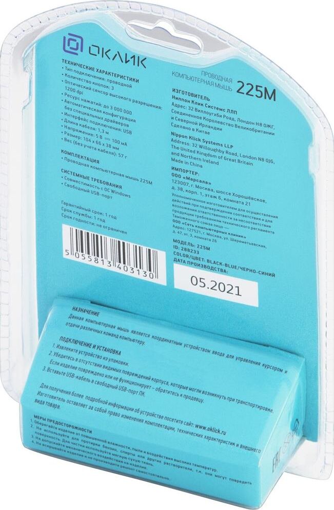 OKLICK 225M черный/синий оптическая (1200dpi) USB (2but)