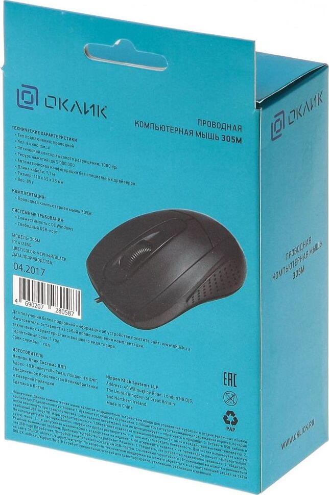 OKLICK 305M черный оптическая (1000dpi) USB (2but)