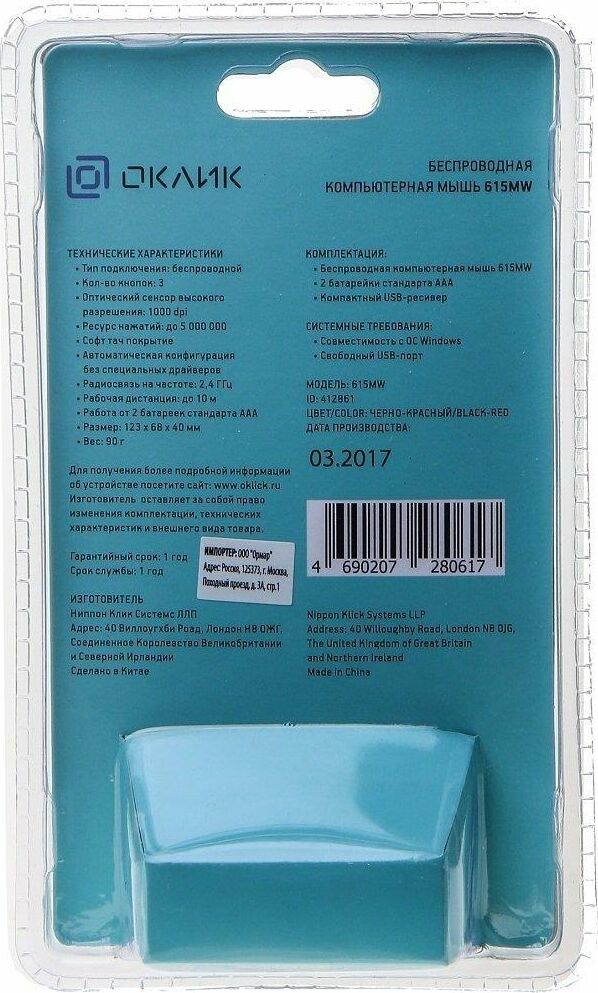 Мышь беспроводная OKLICK 615MW черный/красный оптическая (1000dpi) беспроводная USB (2but)