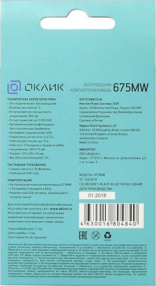 Мышь беспроводная OKLICK 675MW синий