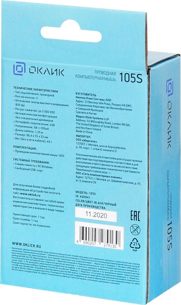 Мышь беспроводная ОКЛИК 105S черный
