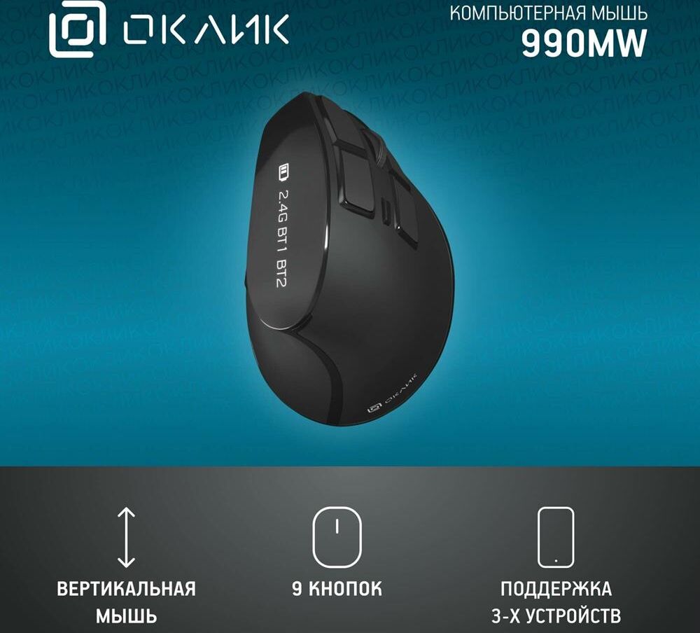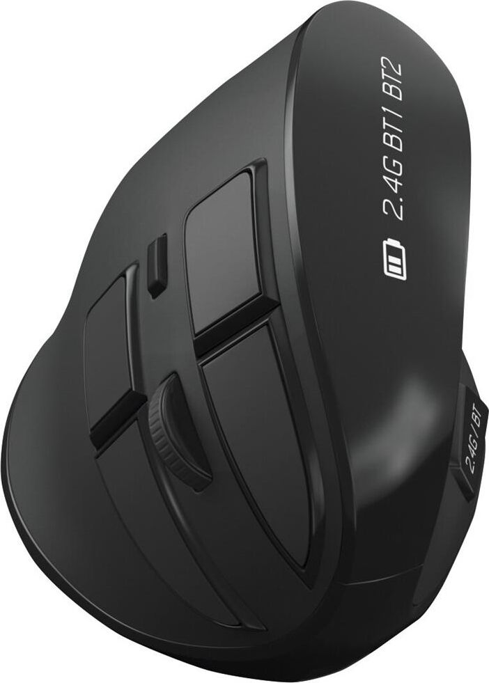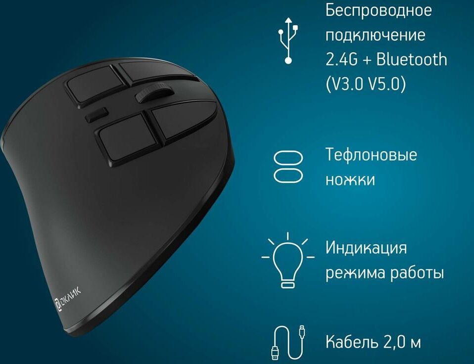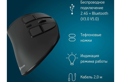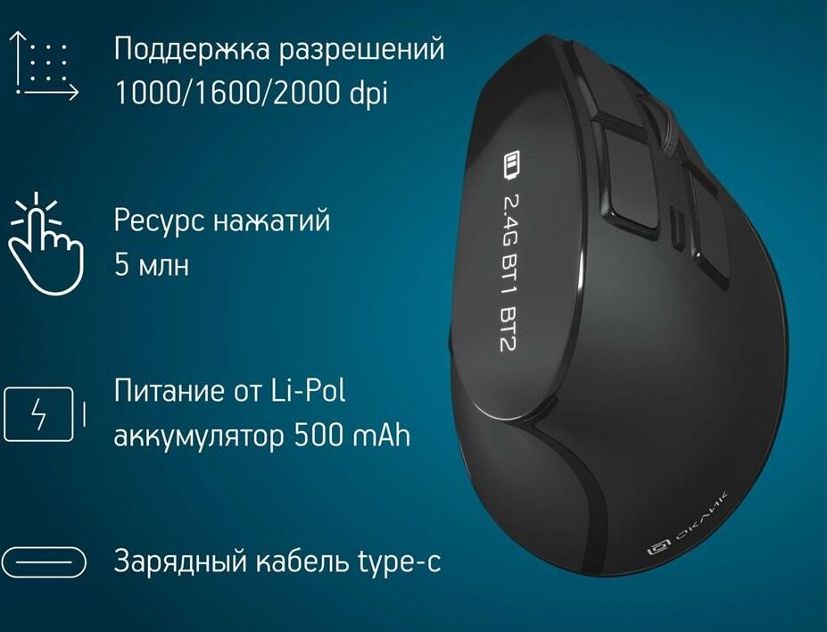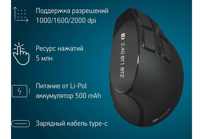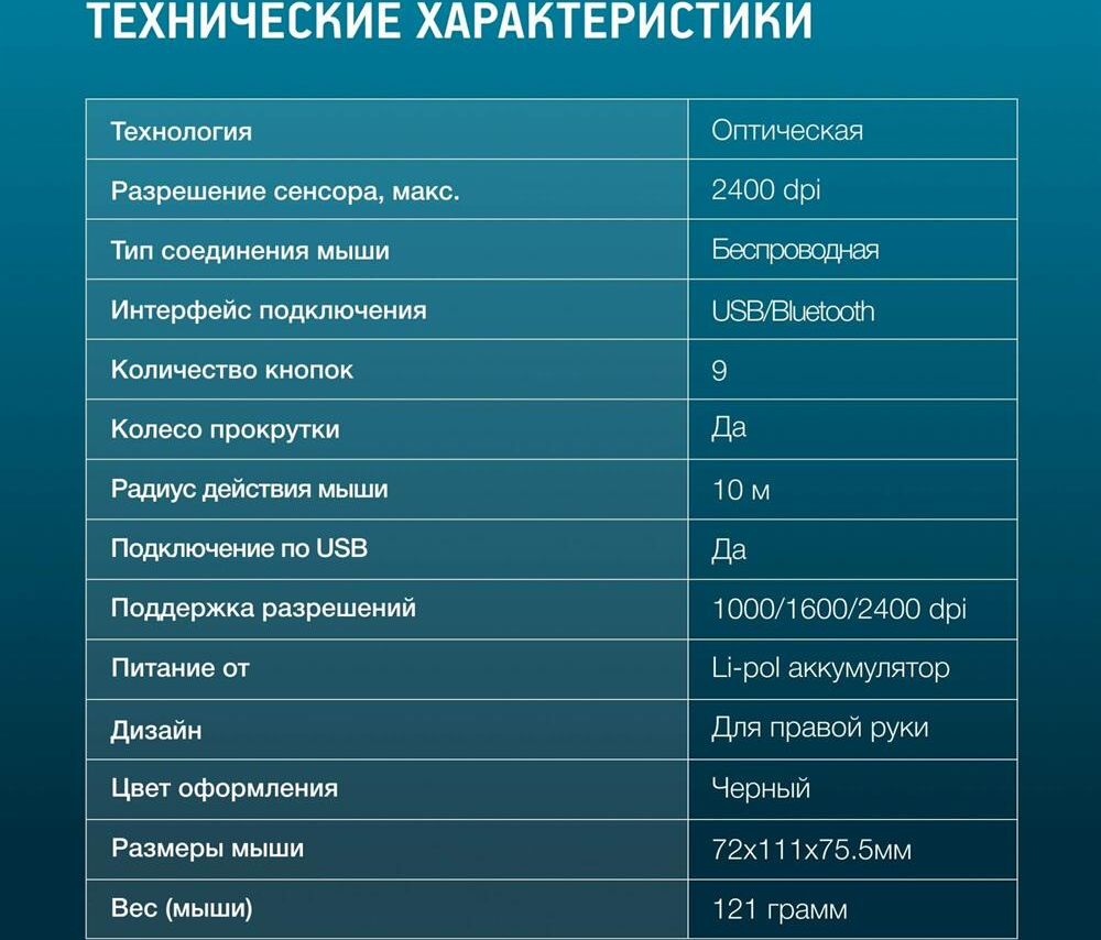 Мышь беспроводная, интерфейс подключения USB, встроенный Li-Pol аккумулятор 500 mAh, можно подключить по Bluetooth , количество кнопок - 9, колесо прокрутки, изменяемое разрешение - 1000/1600/2400 dpi, корпус выполнен из матового пластика с Soft-touch покрытием.