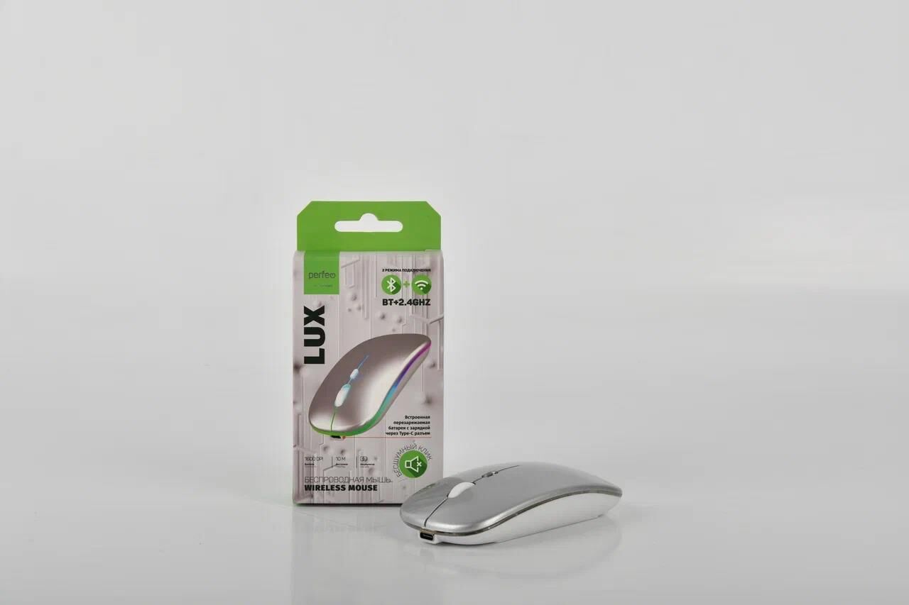 МОДЕЛЬ: LUX (БЕСПРОВОДНАЯ) • Два режима подключения (радиочастота 2,4 ГГц или Bluetooth) • Усовершенствованная беспроводная технология (радиус работы до 10 м) • Высокоточный сенсор с переключаемым разрешением: 800/1200/1600 DPI • Четыре кнопки с колесом прокрутки • Бесшумные кнопки • Прорезиненное колесо прокрутки • PlugnPlay, не требуется установка ПО • Симметричная форма мыши подходит для правой и левой руки • Внутренняя контурная RGB подсветка • Мини-ресивер USB (в комплекте) • Зарядка через кабель Type-C (в комплекте) • Выключатель питания мыши • Системные требования: Windows 10/8/7/XP, Mac OS, свободный порт USB • Размеры: 112 ? 57,2 ? 25,9 мм