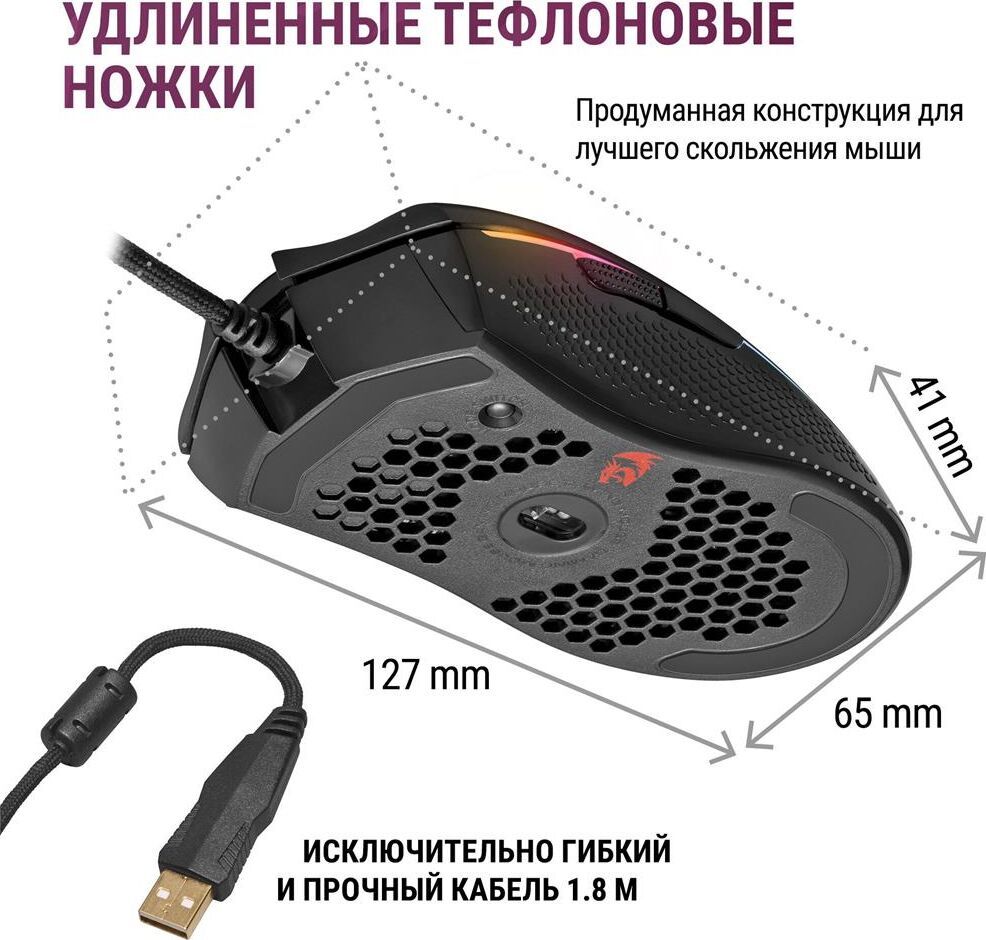 Гибкий тканевый кабель Прочные тефлоновые ножки легко скользят по поверхности стола Сохранение профилей Редактор макросов Кнопка переключения DPI Удлиненные тефлоновые ножки Уникальный запатентованный дизайн