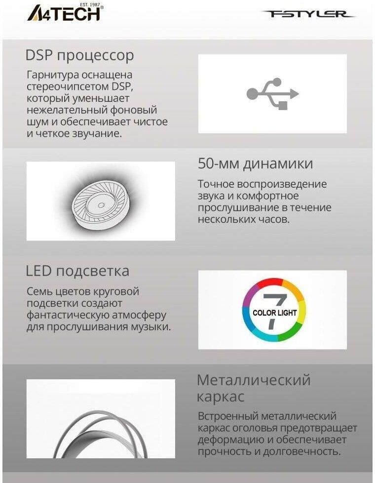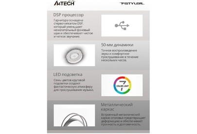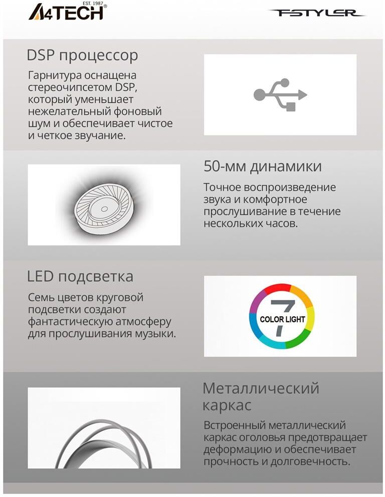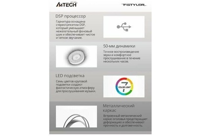 Конструкция Бренд A4TECH Модель Fstyler FH300U Тип гарнитуры стерео Крепление оголовье Тип конструкции мониторные Тип соединения гарнитуры проводные USB Крепление микрофона гибкий всенаправленный Регулятор громкости есть Тип регулятора громкости на наушниках Наушники Тип, акустический закрытые Диаметр головок излучателей 50 мм Частотный диапазон 20 Гц - 20 кГц Материал магнита Nd Импеданс 16 Ом Чувствительность динамика 100 дБ Микрофон Частотный диапазон 100 Гц - 10 кГц Чувствительность микрофона --44 дБ Шумоподавление микрофона есть Подключение Коннектор (гарнитура) USB Тип коннектора прямой Подключение кабеля одностороннее Длина шнура 2 м Особенности Подсветка есть Цвет подсветки разноцветный Цвет, вес Цвет белый Вес (без шнура) 238 г