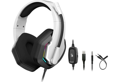 Тип гарнитуры: стерео. Тип, акустический: закрытые. Тип конструкции: мониторные. Тип соединения гарнитуры: проводные USB. Импеданс: 16. Чувствительность динамика: 100. Длина шнура: 2. Крепление микрофона: поворотный однонаправленный. Крепление: оголовье. Регулятор громкости: есть. Тип регулятора громкости: на наушниках. Диаметр головок излучателей: 50. Материал магнита: неодимовый. Выключение микрофона: есть. Шумоподавление микрофона: есть. Тип коннектора: прямой. Подключение кабеля: двухстороннее. Для геймеров: да. Вес (без шнура): 288. Подсветка: есть. Материал амбушюров: искусственная кожа. Цвет подсветки: разноцветный. Коннектор (гарнитура): USB. Габариты упаковки (ед) ДхШхВ: 0.19x0.105x0.223. Вес упаковки (ед): 0.53. Гарантия: 12 мес.. Частотный диапазон: 20 Гц - 20 кГц. Частотный диапазон: 100 Гц - 10 кГц. Цвет: белый / черный. Чувствительность микрофона: -42 дБ. Особенности: игровая, с подсветкой. Управление: регулятор громкости, выключение микрофона. Конструктив: микрофон поворотный однонаправленный,