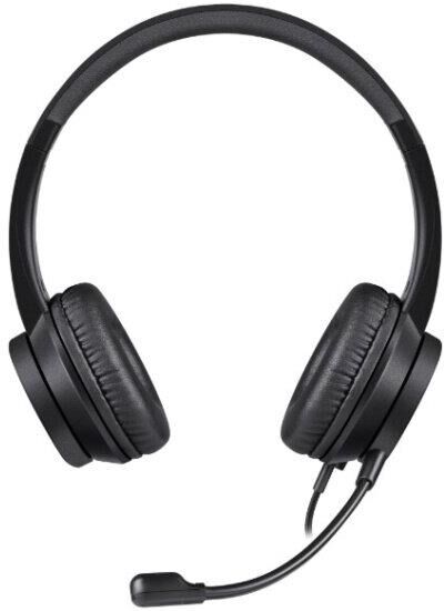 Легкая компьютерная гарнитура с регулируемым оголовьем, мягкими амбушюрами и регулятором громкости.