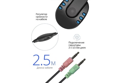 Гарнитура игровая, импеданс - 32 Ом, чувствительность - 106 дБ, частотный диапазон 20–20000 Гц, разъемы - 2 x 3,5-мм джек, регулятор громкости на проводе, длина кабеля - 2,5 м.