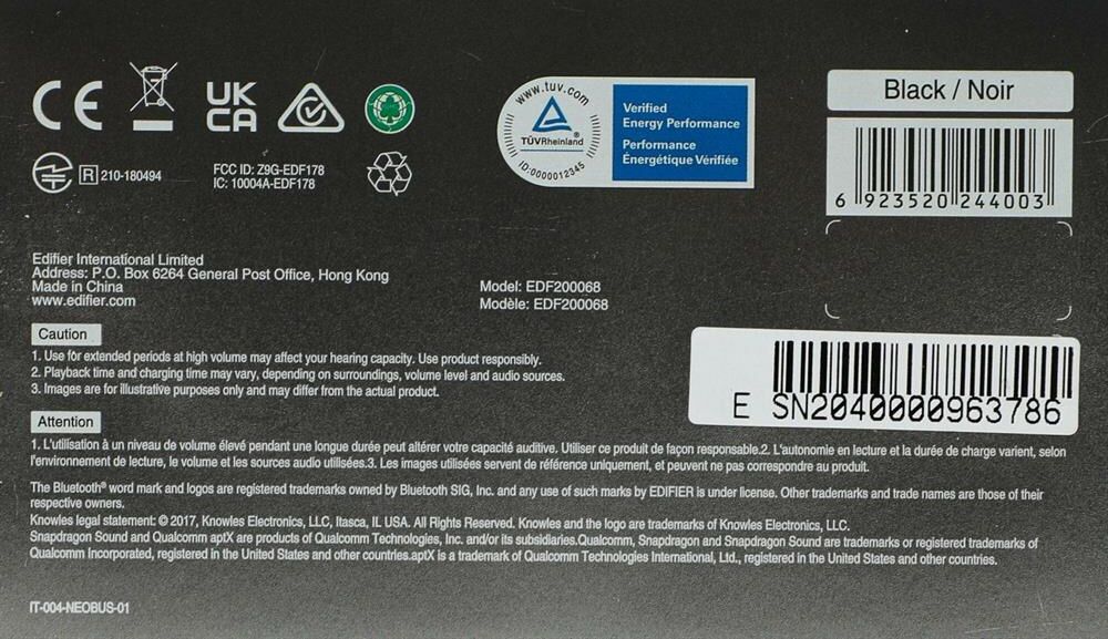 Наушники EDIFIER Гарнитура внутриканальные NeoBuds S черный беспроводные bluetooth в ушной раковине