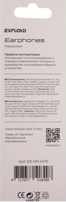 Наушники EXPLOYD (EX-HP-1470) 3.5mm/чёрный/1.2М/Easy
