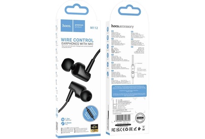 Hoco M112 – это универсальные проводные наушники, которые обеспечивают отличное качество звучания и максимальную степень комфорта. Они совместимы со всей современной электроникой - плеерами, телефонами, компьютерами, имеющими разьем AUX 3.5 мм.Чувствительный микрофон и простое управление обеспечивают удобство при разговоре. Вакуумные наушники имеют вкладыши анатомической формы, за счет этого наушники надежно сидят в ушах и не причиняют никаких неудобств, даже при длительном использовании. Обладают качественным звуком и стильным минималистичным дизайном. На кабеле находится пульт управления с микрофоном и кнопкой для ответа на звонки/воспроизведения музыки. Длина кабеля: 1,2 м; вес: 10 г.
