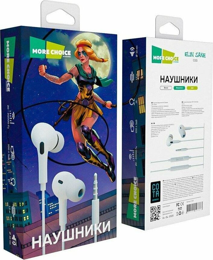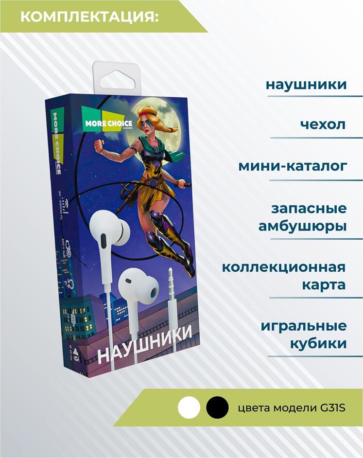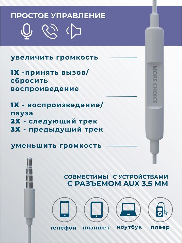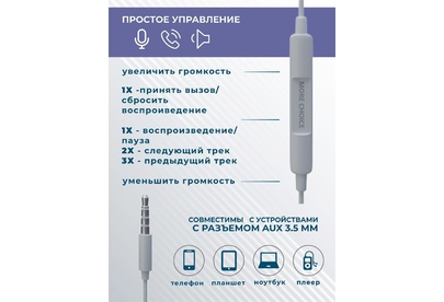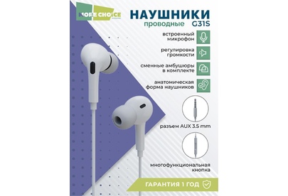 MORE CHOICE G31S Наушники вакуумные AUX разъём с микрофоном и рег.громкости длина 1.2м Динамик: 10 мм Частотный диапазон: 20-20000 Гц Чувствительность: 100 ± 3дБ Микрофон: контроллер с микрофоном и регулировкой громкости Функциональное управление одной кнопкой Длина кабеля: 1,2 м