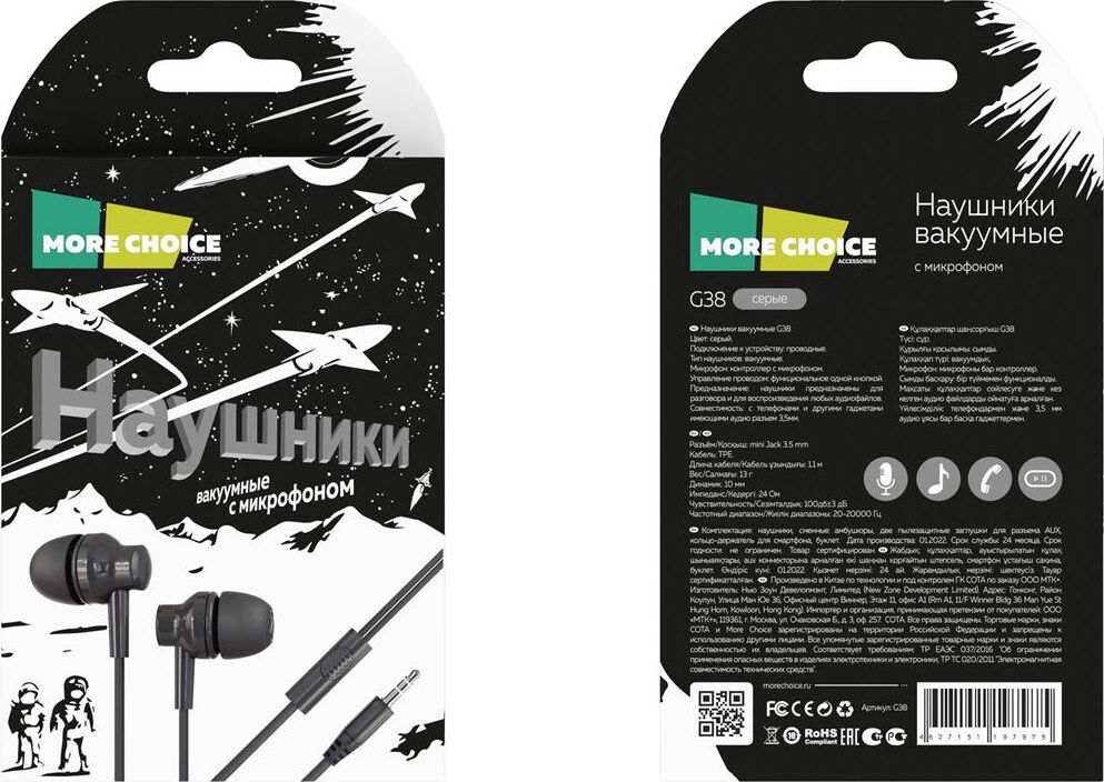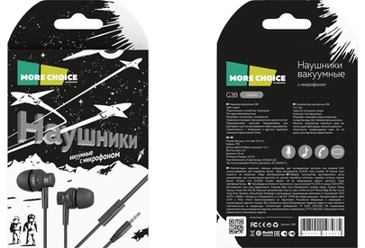 Наушники вакуумные AUX разъём с МК без рег.громкости длина 1.1м More Choice G38 Подключение к устройству: проводные Тип наушников: вакуумные Разъём: miniJack 3,5 мм Динамик: 10 мм Частотный диапазон: 20-20000 Гц Чувствительность: 100дБ±3дБ Импеданс: 24 Ом Микрофон: контроллер с микрофоном, который освобождает ваши руки при входящем вызове от удержания смартфона Управление проводом: функциональное одной кнопкой — ответ на вызов, пауза, переключение аудио Предназначение: наушники предназначены для разговора и для воспроизведения любых аудиофайлов Совместимость: со всеми телефонами и другими гаджетами (планшет, компьютер, иные источники объемного звука), имеющими аудио разъем 3,5мм Кабель: TPE Комплектация: наушники, сменные амбушюры, две пылезащитные заглушки для разъема AUX, кольцо-держатель для смартфона, буклет. Длина кабеля: 1,1 м Вес: 13 г