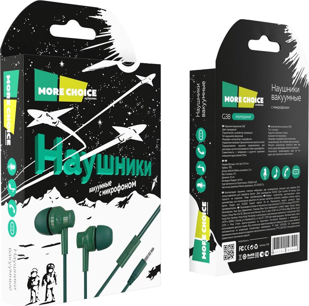 Наушники вакуумные AUX разъём с МК без рег.громкости длина 1.1м More Choice G38 Подключение к устройству: проводные Тип наушников: вакуумные Разъём: miniJack 3,5 мм Динамик: 10 мм Частотный диапазон: 20-20000 Гц Чувствительность: 100дБ±3дБ Импеданс: 24 Ом Микрофон: контроллер с микрофоном, который освобождает ваши руки при входящем вызове от удержания смартфона Управление проводом: функциональное одной кнопкой — ответ на вызов, пауза, переключение аудио Предназначение: наушники предназначены для разговора и для воспроизведения любых аудиофайлов Совместимость: со всеми телефонами и другими гаджетами (планшет, компьютер, иные источники объемного звука), имеющими аудио разъем 3,5мм Кабель: TPE Комплектация: наушники, сменные амбушюры, две пылезащитные заглушки для разъема AUX, кольцо-держатель для смартфона, буклет. Длина кабеля: 1,1 м Вес: 13 г