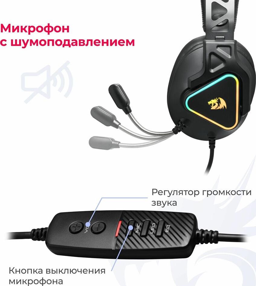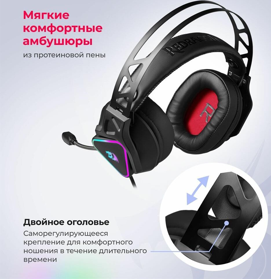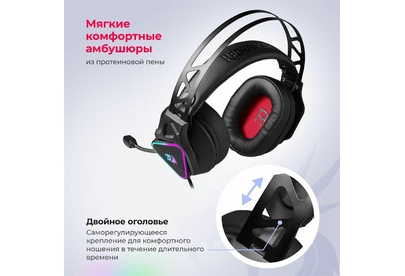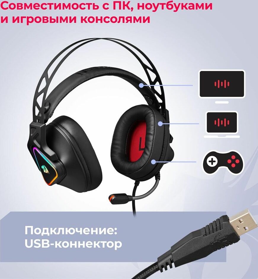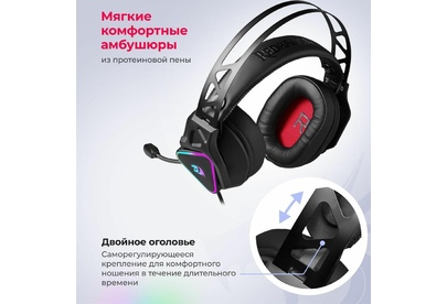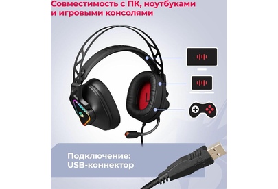 Совместимость с ПК, ноутбуками, игровыми консолями, смартфонами, планшетами Виртуальный объемный звук 7.1 RGB подсветка Двойное оголовье - Саморегулирующееся крепление для комфортного ношения в течение длительного времени. Внешняя жесткая часть фиксирует чашки и обеспечивает плотное прилегание к ушам, а мягкая внутренняя гарантирует удобство и комфорт Мягкие комфортные амбушюры из протеиновой пены Регулятор громкости звука Кнопка выключения микрофона Микрофон с шумоподавлением