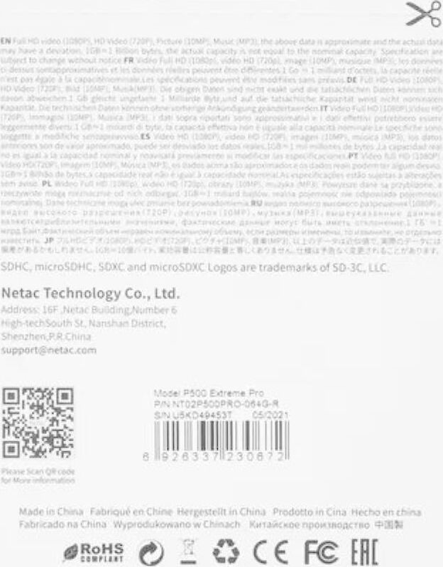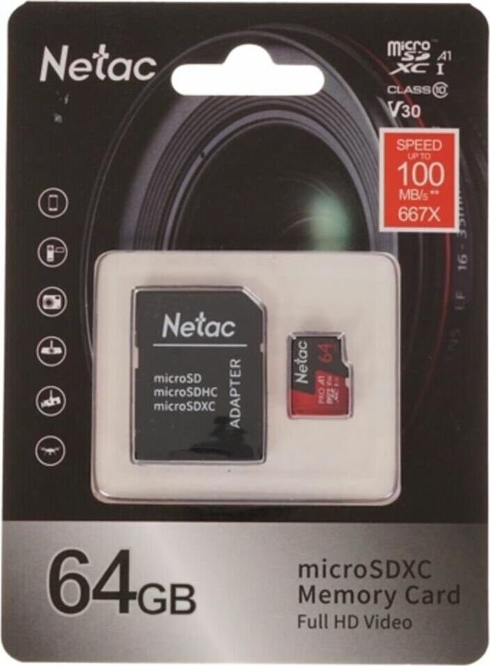 Объем памяти: 64 Гб, класс скорости: Class 10, UHS Class 3, тип: microSDXC, чтение до: 100 Мб/с, адаптер на SD, NT02P500PRO-064G-R