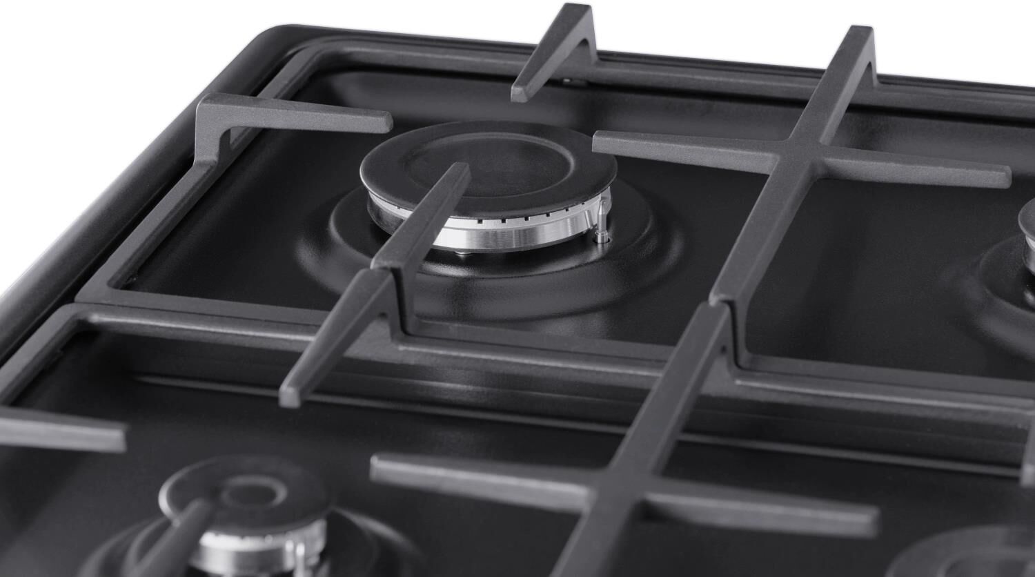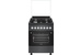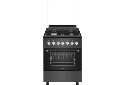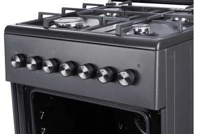 ШхГхВ: 60х60х88,5 см; 4 газовые конфорки; автоподжиг; решетка: чугунная; электрическая духовка с конвекцией: 63 л; полный газ-контроль; подсветка; гриль; отделение для хранения посуды; таймер механический; цвет: графитовый