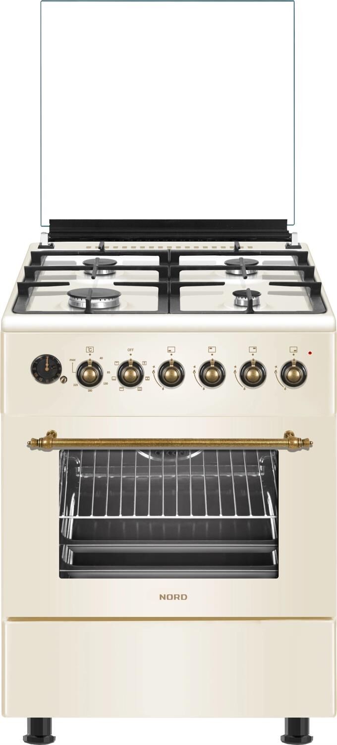 ШхГхВ: 60х60х88,5 см; 4 газовые конфорки; автоподжиг; решетка: чугунная; электрическая духовка с конвекцией: 63 л; полный газ-контроль; подсветка; гриль; отделение для хранения посуды; таймер ("часы"); цвет: бежевый