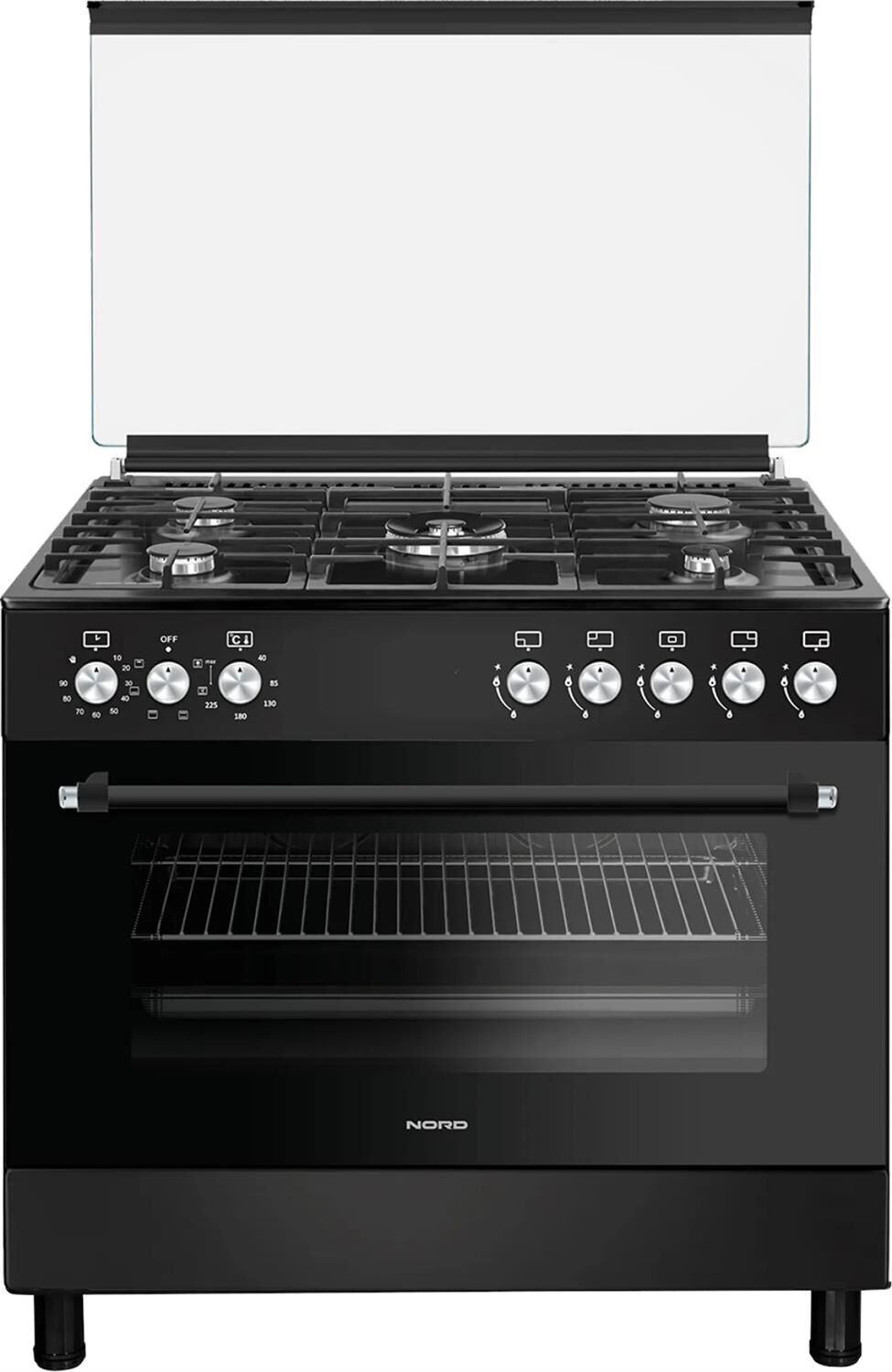 ШхГхВ: 90х60х88,5 см; 5 газовых конфорок, включая WOK-конфорку итальянского бренда SABAF; полный газ-контроль; автоподжиг; решетка: чугунная; электрическая духовка с двойной конвекцией: 110 л; 6 режимов; подсветка; гриль; отделение для хранения посуды; таймер механический с автоотключением духовки; 2 противня, 1 хромированная решетка; крышка: стекло; цвет: черный