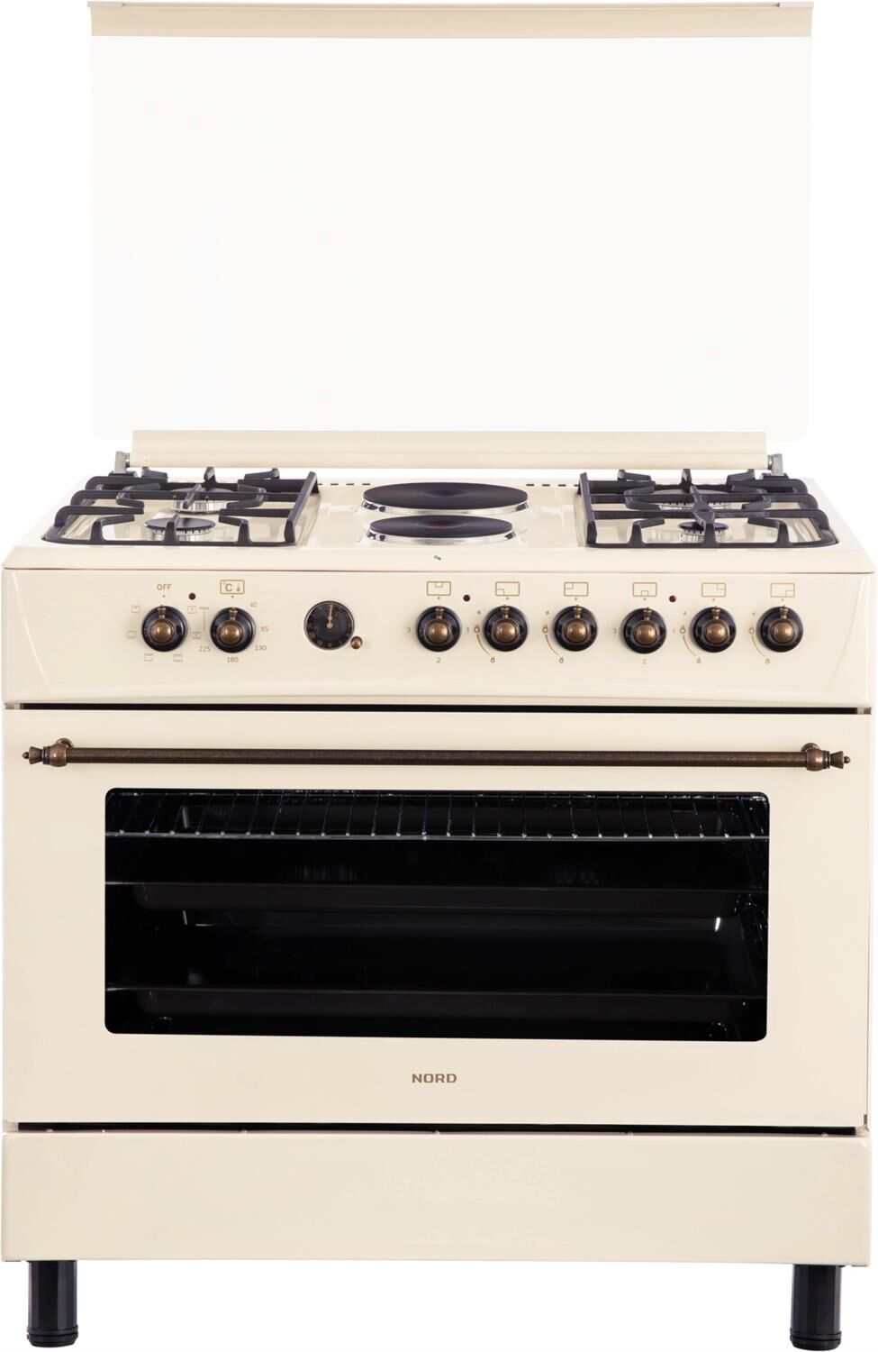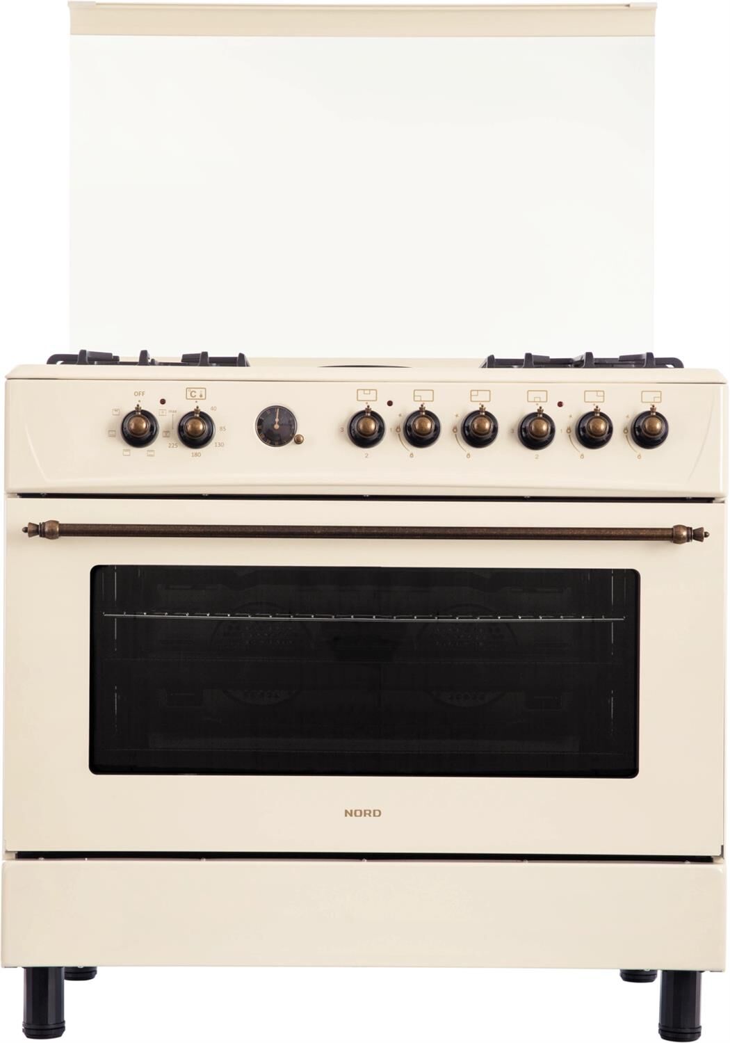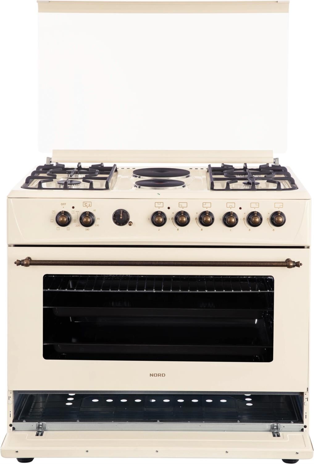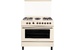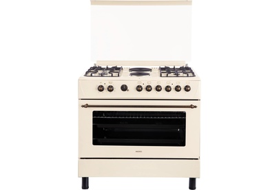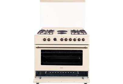 GE 9262 YR: ШхГхВ: 90х60х88,5 см; 4 газовые конфорки, 2 электрические конфорки (по 1,5 кВт); автоподжиг; решетка: чугунная; электрическая духовка с двойной конвекцией: 110л; 6 режимов; подсветка; электрогриль; отделение для хранения посуды; таймер ("часы") с автоотключением духовки; 2 противня, 1 хромированная решетка; переходник для турки; крышка: стекло; цвет: бежевый