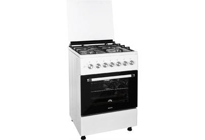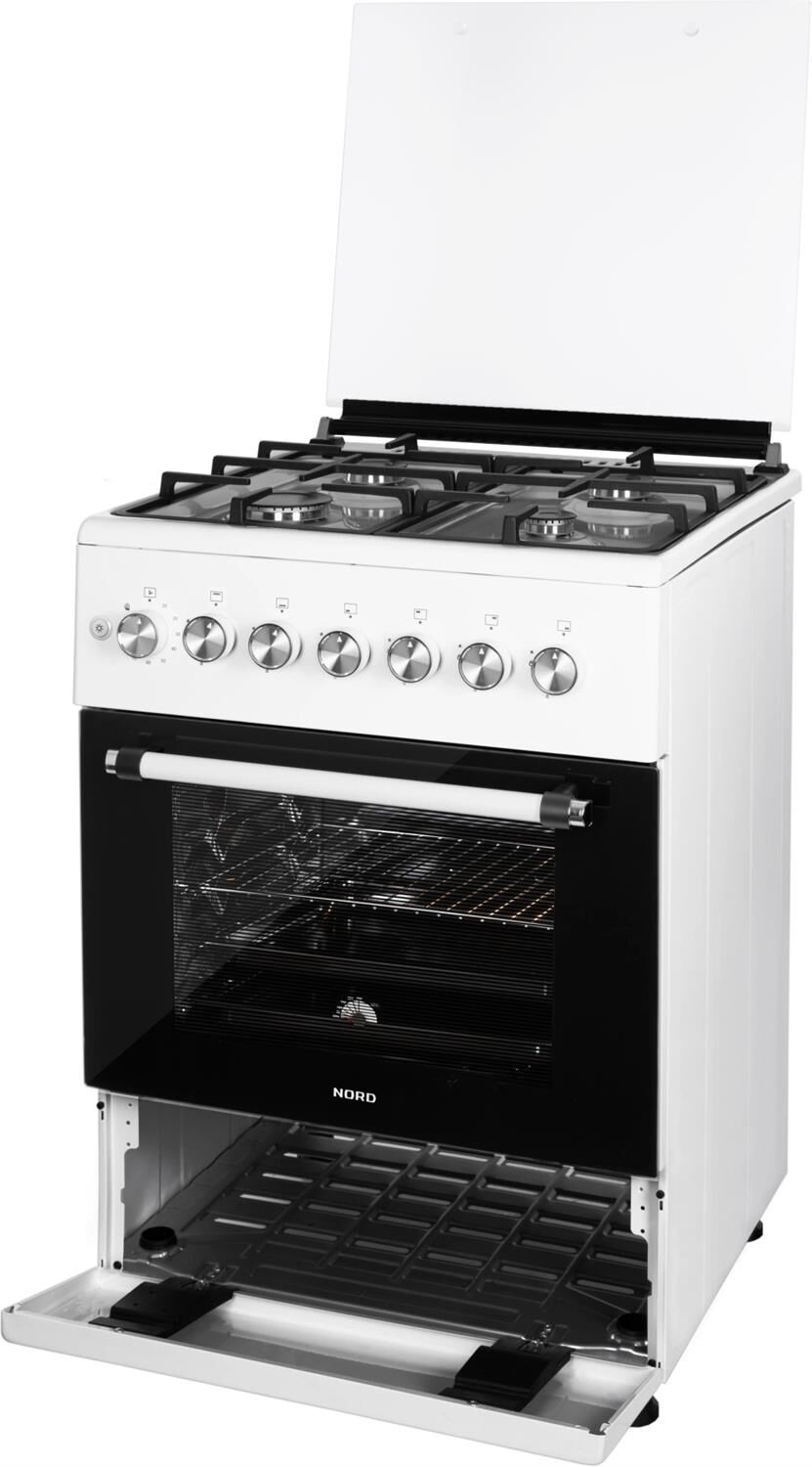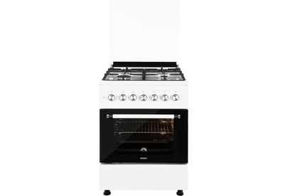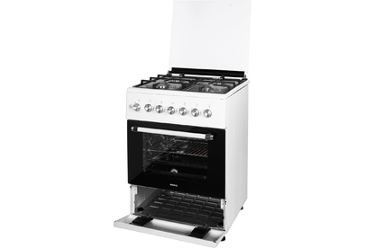 ШхГхВ: 60х60х88,5 см; 4 газовые конфорки; полный газ-контроль; автоподжиг; решетка: чугунная; газовая духовка: 63 л; 2 режима; подсветка; гриль; энергосберегающее стекло дверцы духовки; механический термометр для духовки; отделение для хранения посуды; таймер механический; 2 противня, 1 хромированная решетка; крышка: стекло; цвет: белый
