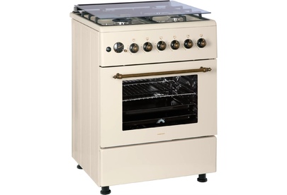 ШхГхВ: 60х60х88,5 см; 4 газовые конфорки; полный газ-контроль; автоподжиг; решетка: чугунная; газовая духовка: 63 л; 2 режима; подсветка; гриль; энергосберегающее стекло дверцы духовки; механический термометр для духовки; отделение для хранения посуды; таймер ("часы"); 2 противня, 1 хромированная решетка; крышка: стекло; цвет: бежевый