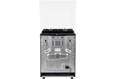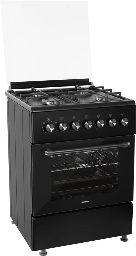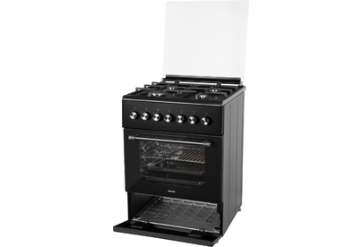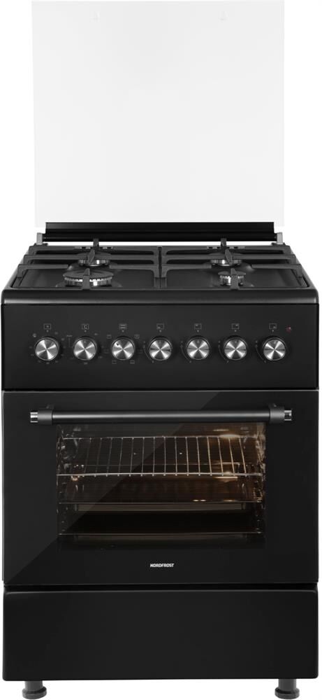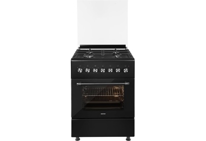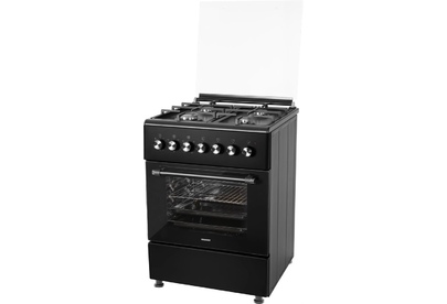 ШхГхВ: 60х60х88,5 см; 4 газовые конфорки; автоподжиг; решетка: чугунная; электрическая духовка с конвекцией: 63л; полный газ-контроль; подсветка; гриль; отделение для хранения посуды; таймер механический; цвет: черный матовый