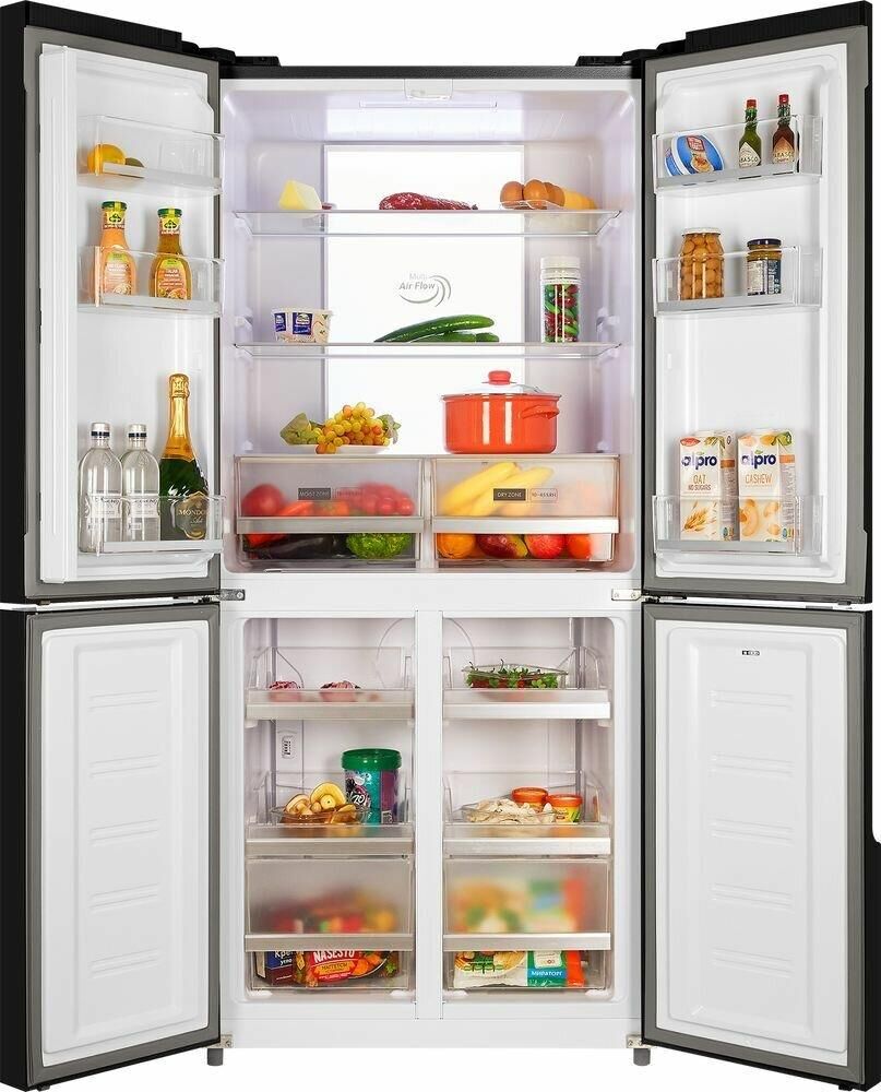 Количество камер: трехкамерный. Расположение морозильной камеры: снизу. Тип управления: электронное. Класс энергопотребления: A+. Система размораживания: No Frost. Общий объем холодильника: 470. Уровень шума: 41. Количество компрессоров: один. Хранение при отключении питания: 11. Мощность замораживания: 7. Количество полок: 3. Количество ящиков: 2. Материал полок: закаленное стекло. Зона свежести: есть. Количество полок: 4. Система размораживания: No Frost. Тип: Холодильник. Полезный объем холодильника: 427. Полезный объем холодильной камеры: 286. Полезный объем морозильной камеры: 141. Хладагент: R600a. Количество ящиков: 2. Вес (нетто): 87. Количество дверей: 4. Тип компрессора: инверторный. Габариты упаковки (ед) ДхШхВ: 0.88x0.71x1.9. Вес упаковки (ед): 94. Страна производства: Китай. Инверторный компрессор: есть. Количество полок на дверце: 6. Материал дверей: стекло. Наличие морозильной камеры: есть. Температура морозильной камеры max: -15. Температура морозильной камеры min: -24. Температура холодильной