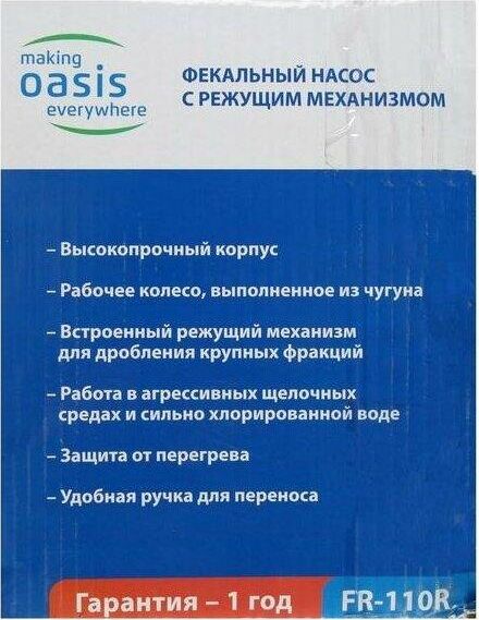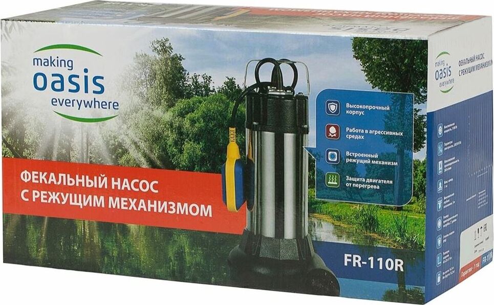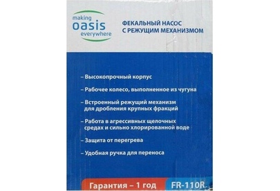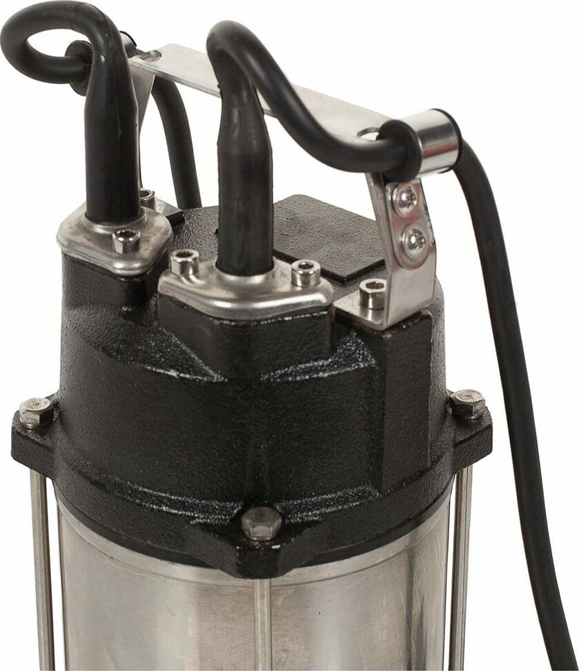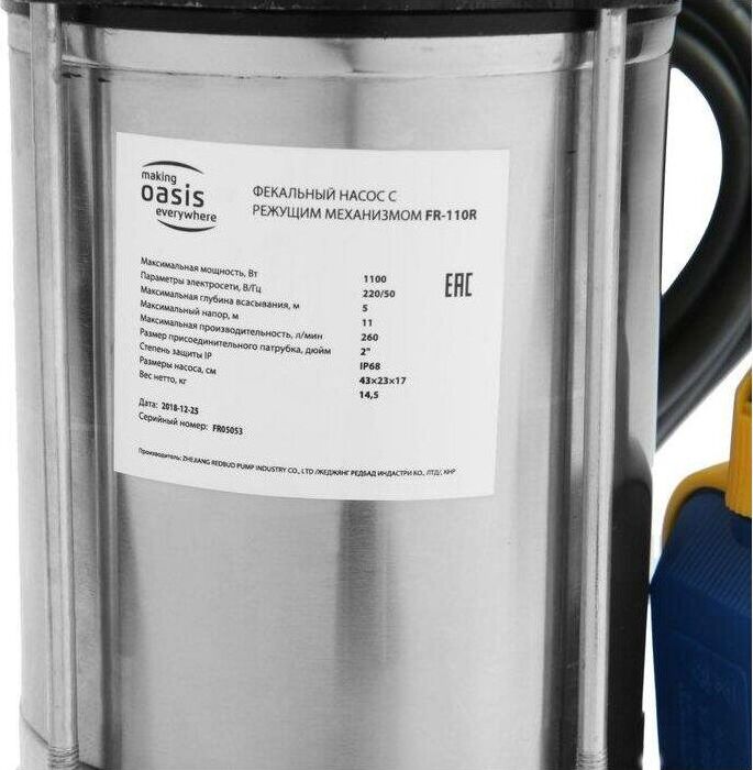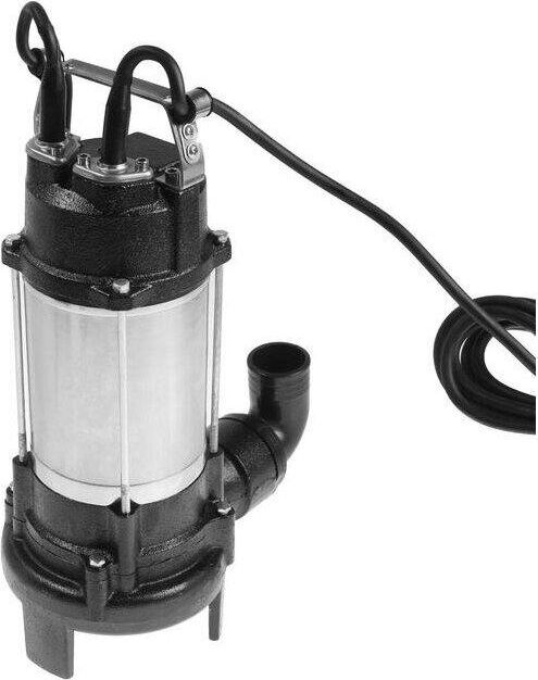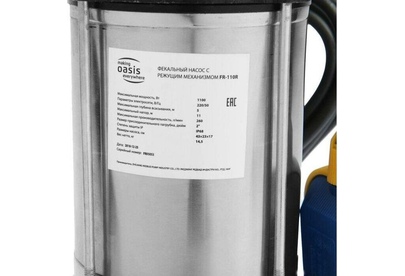 Насос фекальный с режущим механизмом, мощность 1100 Вт, максимальный напор 11 метров, максимальный расход 260 л/мин, максимальный размер пропускаемых частиц 50 мм, максимальная глубина погружения 8 метров, материал корпуса чугун, материал крыльчатки чугун