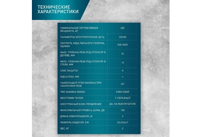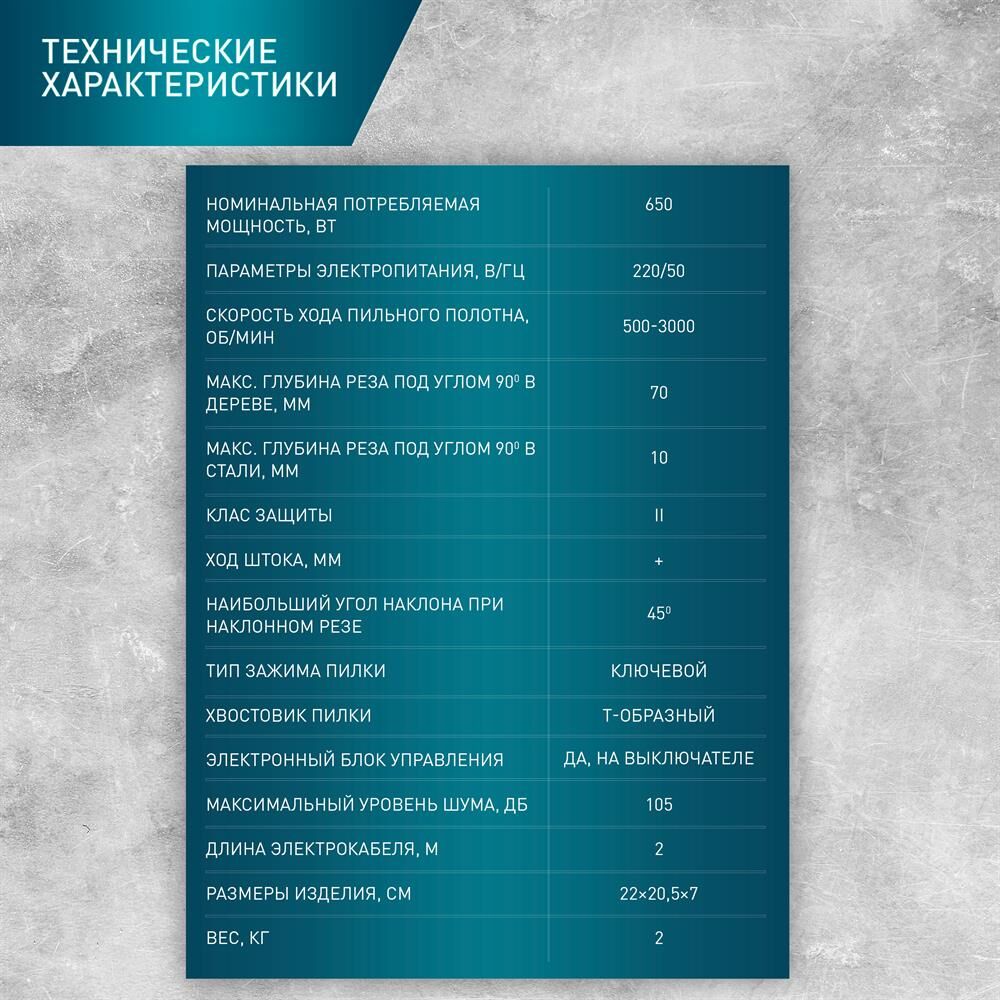 650 Вт; 220/50 В/Гц; 800-3000 ; Ход штока 18 мм; Максимальная глубина пропила в дереве 70 мм; Максимальная глубина пропила в стали 10 мм;