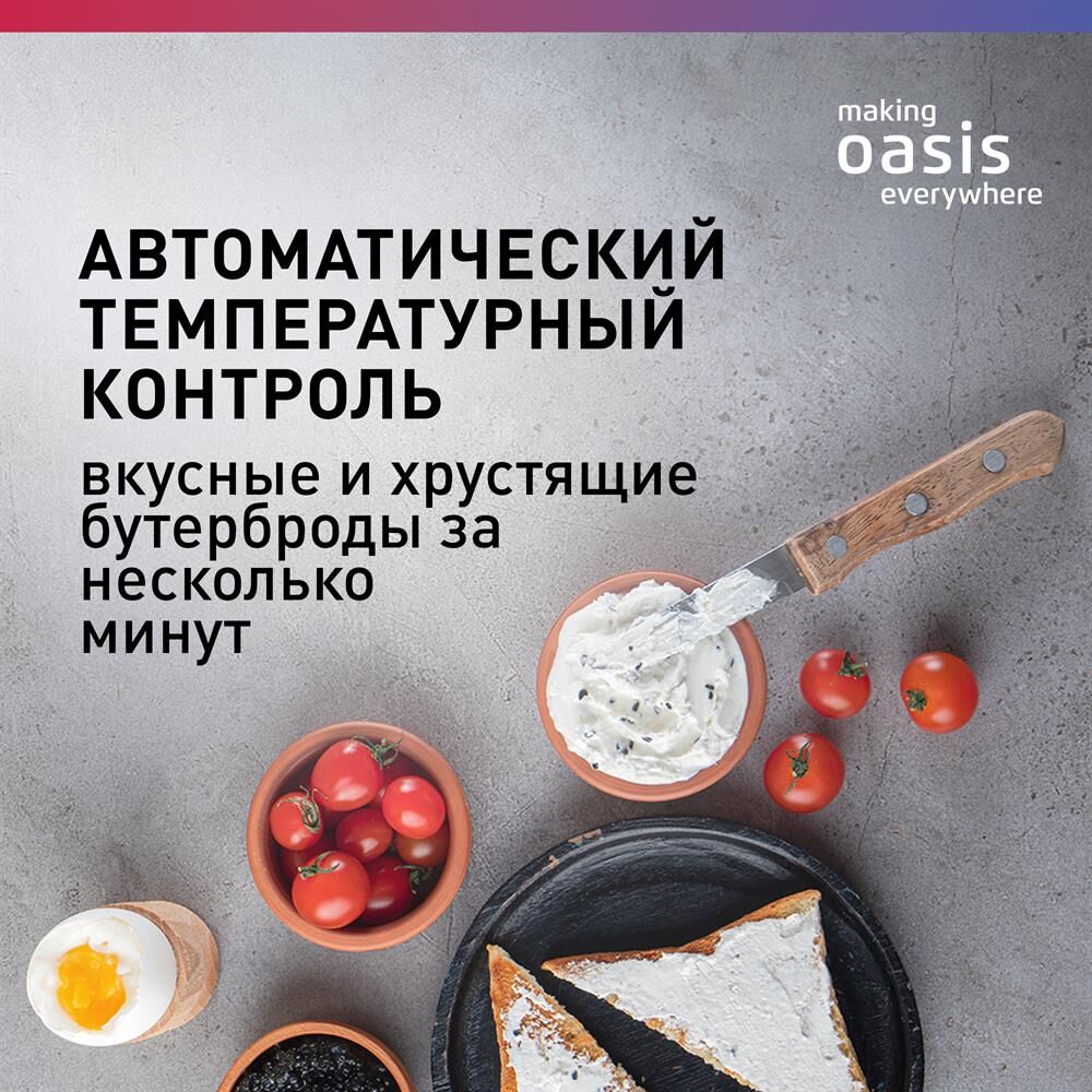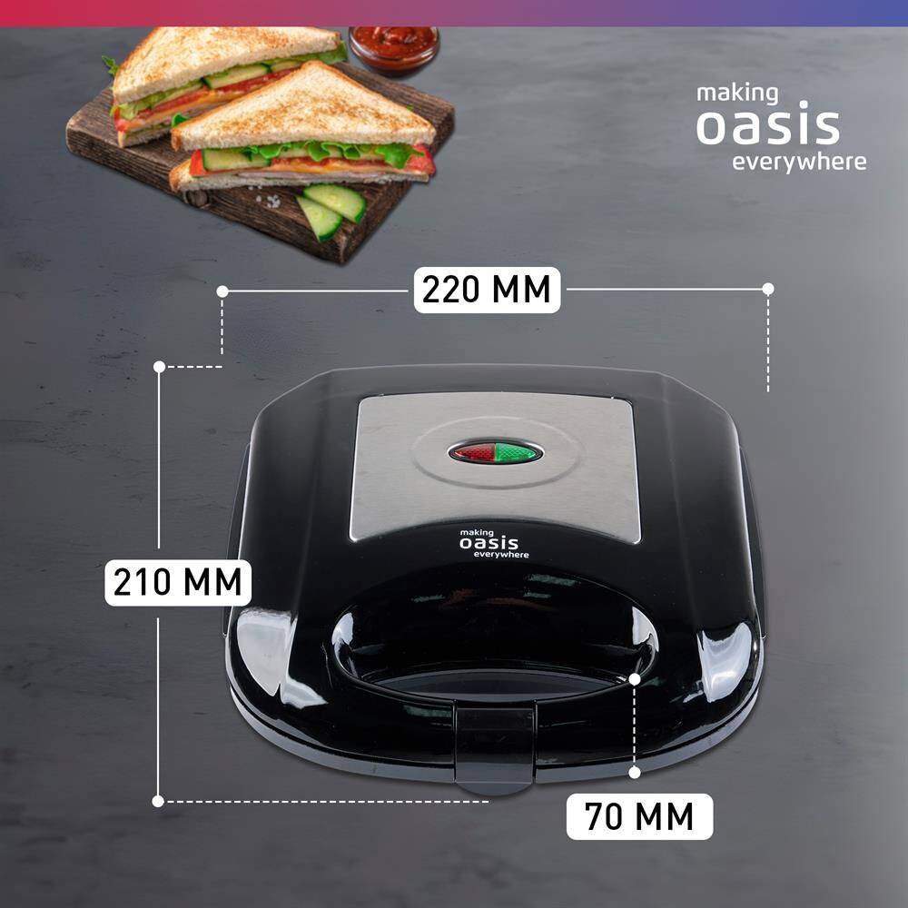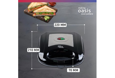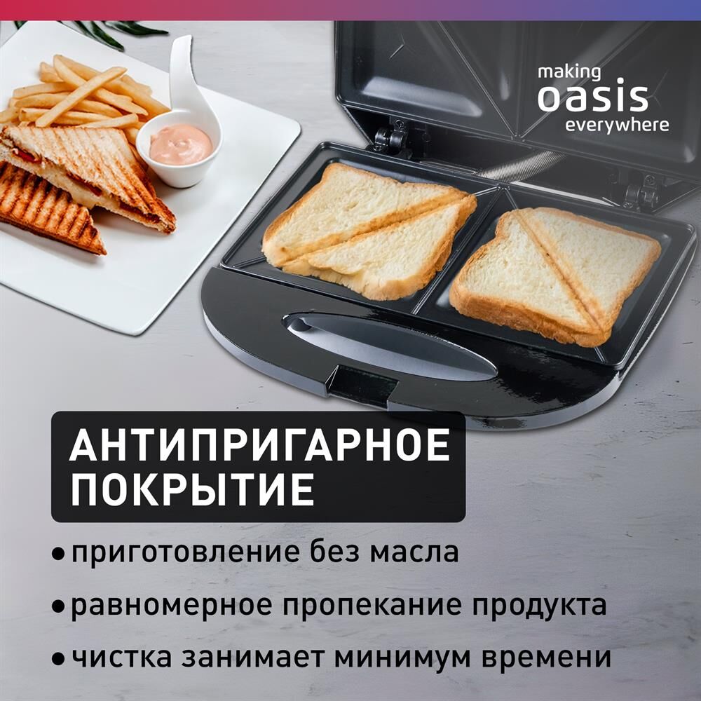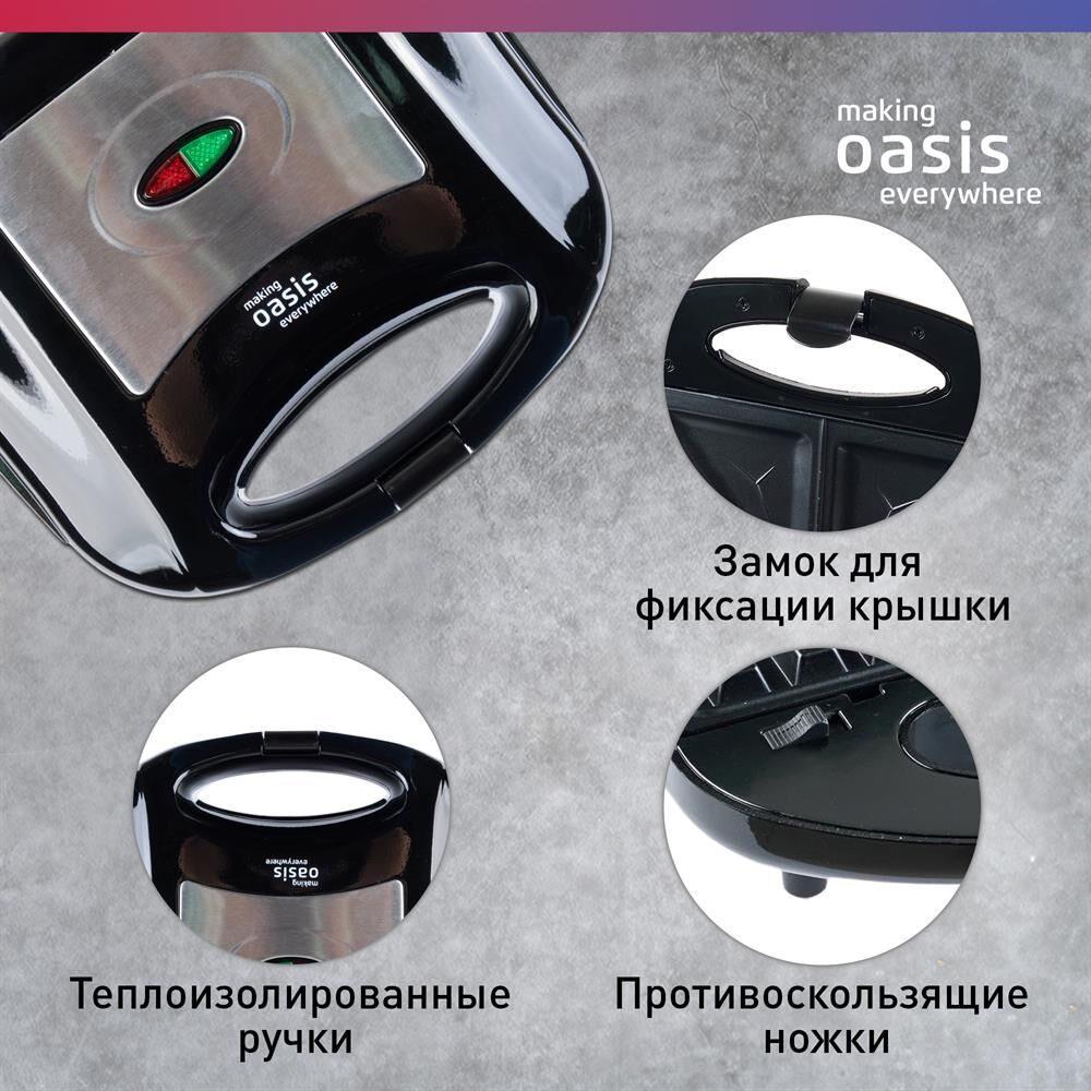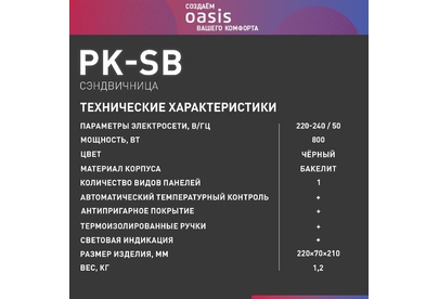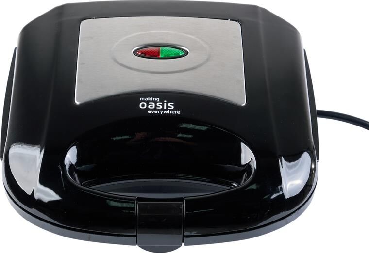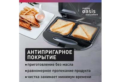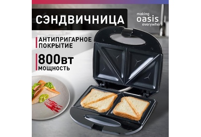 Параметры электросети, В/Гц 220-240 / 50 Мощность, Вт 800 Цвет черный Материал корпуса бакелит Количество съемных панелей 1 Размер изделия, мм 220?70?210 Антипригарное покрытие Автоматический температурный контроль Замок для фиксации крышки Индикаторы нагрева и сети Теплоизолированные ручки Противоскользящие ножки