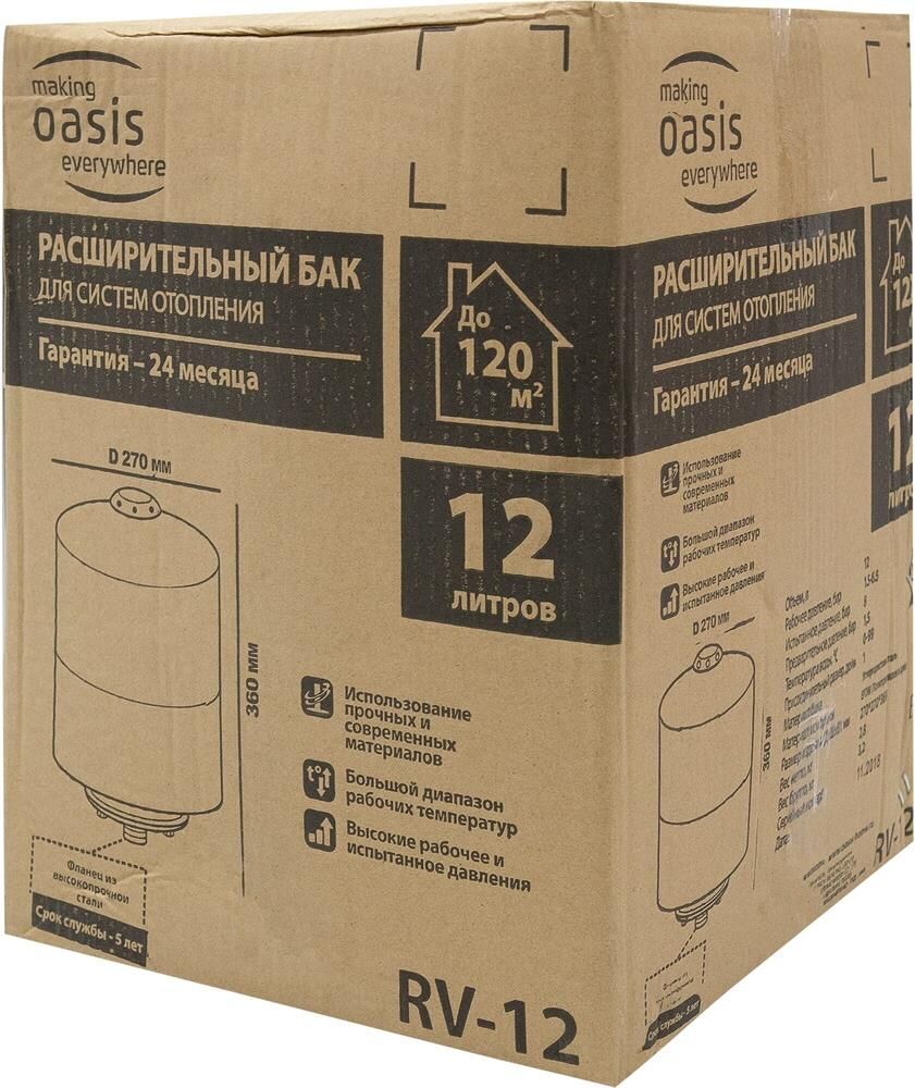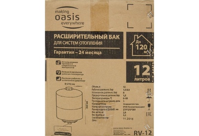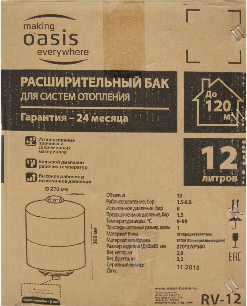 Объем, л12. Рабочее давление, бар 1.5-6.5. Испытанное давление, бар 8. Минимальная температура, °С 0. Максимальная температура, °С 99. Предварительное давление, бар 1.5. Материал бака Углеродистая сталь. Материал мембраны EPDM (Полипропилен и диен). Вес нетто, кг 2,8. Производство Китай.